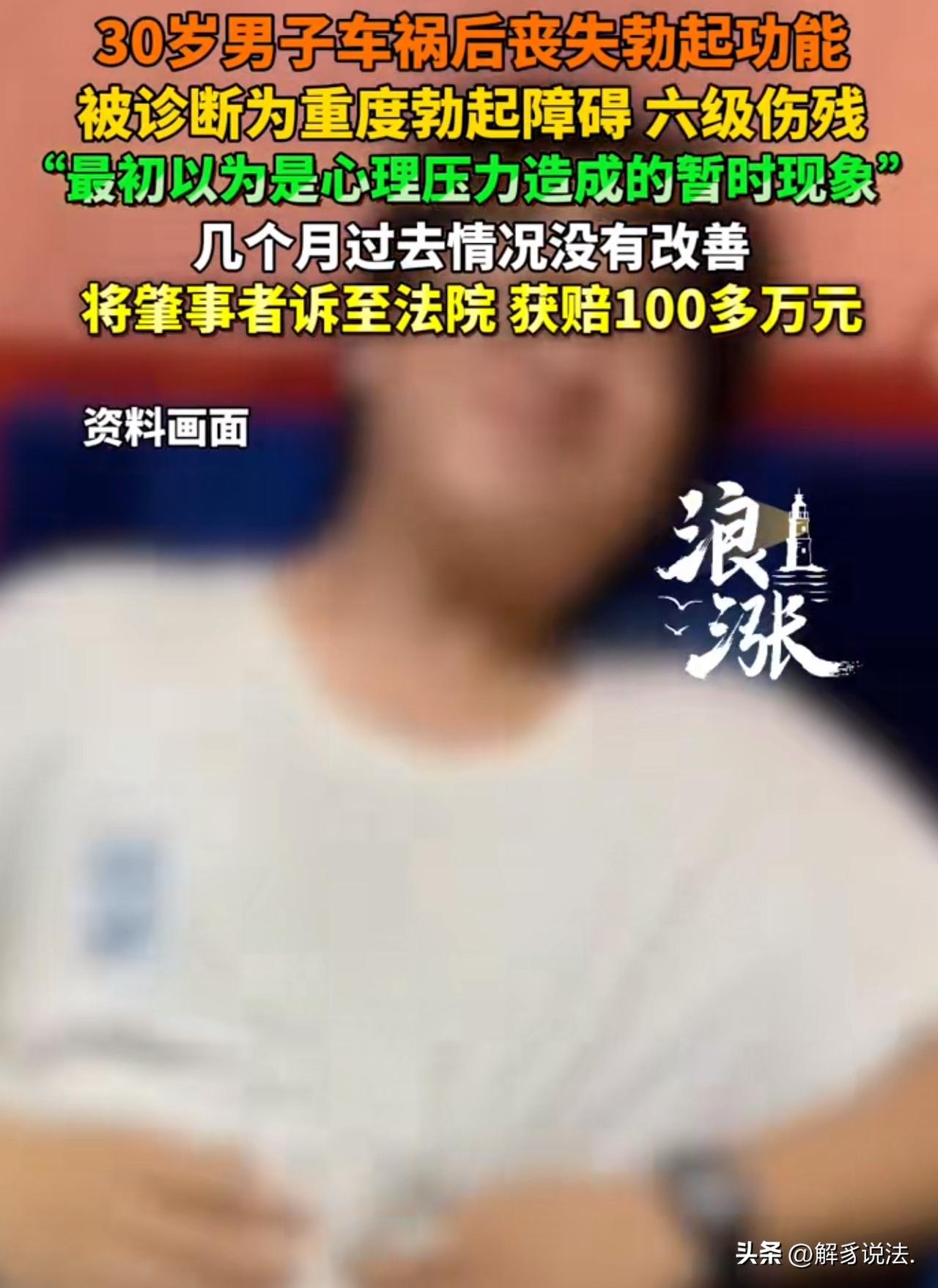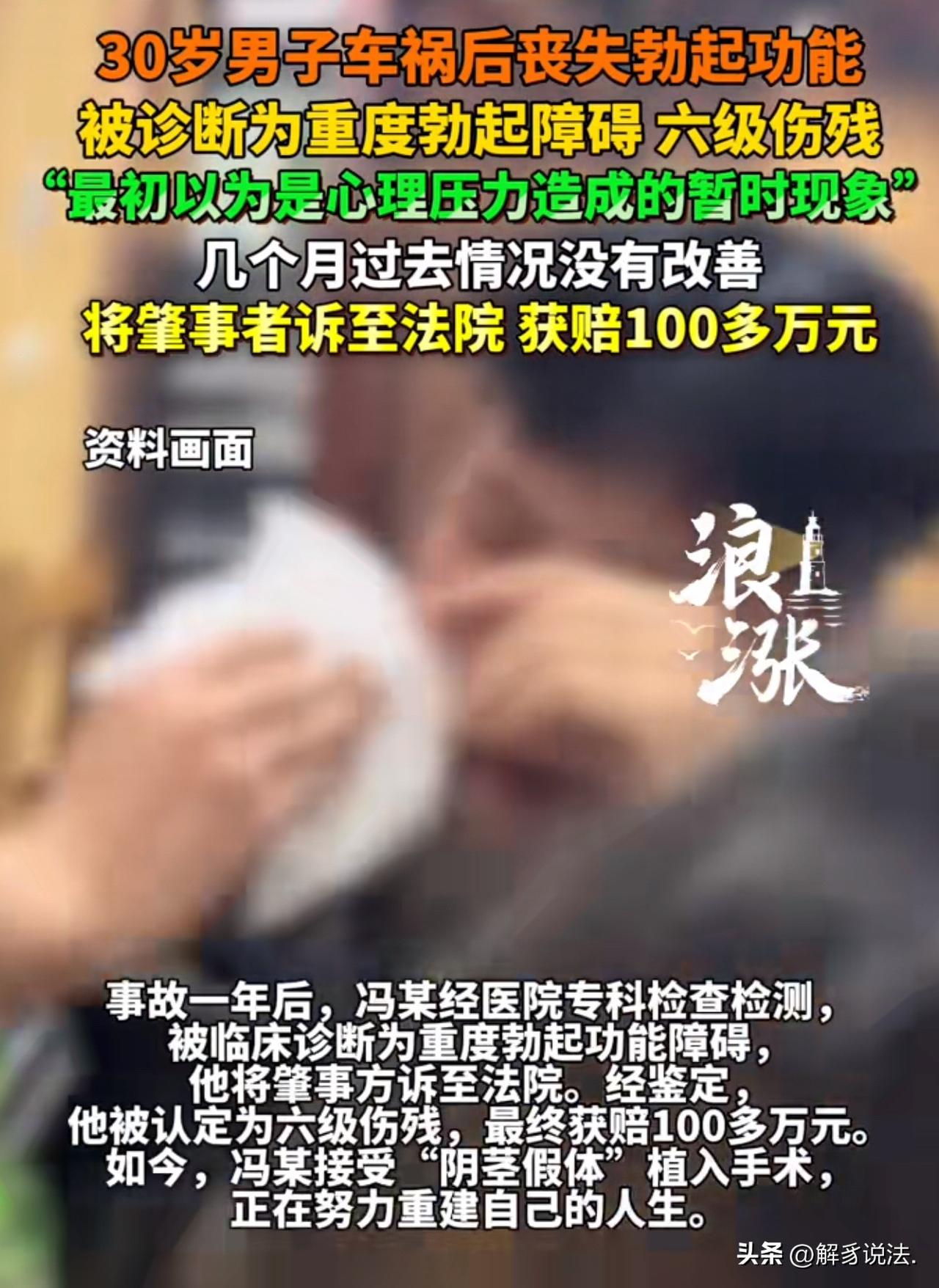 “千金买不来幸福了!”30岁男子发生车祸后,发现自己丧失勃起功能,起初,以为是心理压力造成的现象,只是暂时的,可几个月过去了,还是没有好转,一年后,男子不能精神和身体的双重煎熬,终于鼓起勇气去医院查看病情,结果,却被诊断为重度勃起障碍六级伤残。男子非常痛苦和愤怒,直接将肇事者诉至法院 ,法院判赔100多万。网友:羡慕,30岁就是百万富翁了! 30岁的冯某怎么都没料到,一场突如其来的车祸,让他捡回了一条命,却彻底失去了作为男人的威严,往后的日子,全被难以启齿的痛苦填满。 那天车祸来得毫无征兆,冯某直接被撞得身受重伤,全身多处骨折,被送到医院的时候,已经处于创伤性休克状态,情况万分危急。 好在医生全力抢救,做了好几次大手术,总算把他从鬼门关拉了回来。 那时候他还满心庆幸,觉得能活下来就是天大的好事,大难不死必有后福,可万万没想到,更折磨人的事儿还在后面。 身体慢慢恢复,伤口渐渐好转,冯某却发现自己出了大问题,他彻底丧失了勃起功能。 这个事儿让他又羞又恼,心里满是憋屈和自卑,他不好意思和外人说,怕别人笑话,指指点点。 这件事他只能放在心里,搞得他寝食难安夜不能寐,整个人都焦虑了。 他只能反复安慰自己,肯定是刚做完手术身体太虚,再加上心里压力太大,才出现这种情况,缓上一阵子肯定就能恢复。 就这样熬了一天又一天,几个月时间匆匆过去,他盼了又盼,可情况没有半点好转。 他偷偷试过各种办法,心里的希望一点点被磨灭,只剩下无尽的绝望和自我怀疑,每天都活在煎熬里,觉得自己活得不像个男人,连头都抬不起来。 在煎熬中度过了一年,冯某终于鼓起勇气,专门去医院专科做了全面检查,结果被明确诊断为重度勃起功能障碍。 拿到诊断结果的那一刻,他又心酸又气愤,知道这不是自己的问题,是这场车祸毁了自己的正常生活, 于是,他找到肇事方讨要说法,可对方认为他认为没缺胳膊少腿就不算重伤,认为冯某就是讹人。 冯某暴怒,直接把肇事方告上了法庭,经过专业的伤残鉴定,他被认定为六级伤残。 《民法典》第1179条规定:侵害他人造成人身损害的,应当赔偿医疗费、护理费、交通费、营养费、住院伙食补助费等为治疗和康复支出的合理费用,以及因误工减少的收入,造成残疾的,还应当赔偿辅助器具费和残疾赔偿金。 《民法典》第1183条第一款规定,侵害自然人人身权益造成严重精神损害的,被侵权人有权请求精神损害赔偿。 冯某因车祸构成六级伤残,不仅身体遭受重创,还承受了极大的精神痛苦。 最终,法院做出判决,冯某胜诉,成功拿到了100多万元的赔偿款,这份结果,总算给了他一丝慰藉。 如今,冯某已经接受了阴茎假体植入手术,正在积极配合治疗和康复训练。 虽然经历了常人难以想象的磨难,但他慢慢走出了心理阴影,不再被自卑困住,正一步一步努力重建自己的人生,重新找回好好生活的勇气。 此事曝光后,网友评论扎心了: 三十岁男子在一场车祸后,硬生生成了别人口中拿百万赔偿的“特殊百万富翁”,这代价谁能承受得起啊! 如果是这种代价的话,我绝对不想要这100万!要是断个胳膊、断个手,身体上的伤痛能慢慢适应,赔100万我勉强能接受,可这种伤是毁了一辈子的尊严和生活,给再多钱都换不回来。” 别拿伤残对比,每一种伤害都是不可逆的,这种隐疾带来的心理折磨,比肢体残缺更熬人,不是钱能衡量的,这是他应得的赔偿,不是交换。 这不是发财,是遭了大罪,100万是法律对他人身损害的补偿,是往后治疗康复的保障,没人会拿自己的健康和尊严换钱,换谁都不愿意经历这一切。