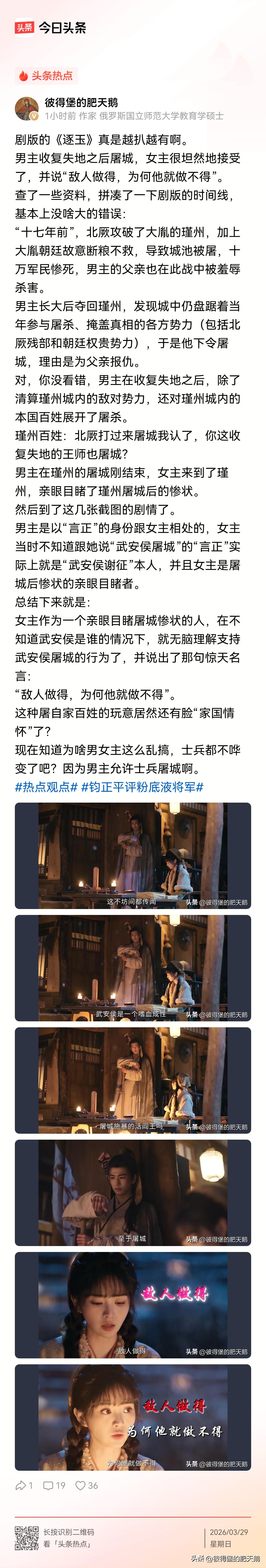 刚刚看有粉丝在评论区说《逐玉》里有运输大队长花园口决堤翻版,出于好奇心,肥鹅找了一下,还真有! 靠,这也是剧版《逐玉》的剧情。 花园口决堤给你点了个赞啊,混蛋。 老头说的这个徒弟就是男主,决堤就是男主策划并下令的。 真他妈常凯申了,我就说这剧怎么越看越眼熟啊。 傻批编剧是不是觉得“是非对错留与后人说”显得很帅很敢作敢当啊? 现在再看这剧情是不是就能理解了?男主是国军那桌的啊。 所以说,这部剧有严重的价值观问题,“粉底液”将军造型与之相比反而是小事情。 补充图3:瑾州敌人没长期占领,屠了一波就走了,之后这座城名义上还是朝廷管辖,但实际上处于边缘处境。 但古代城池是很重要的,别的地方的流民会迁移过来,本地也有幸存者,17年的时间人口也能自然恢复一些。 #钧正平评粉底液将军# #热点观点#