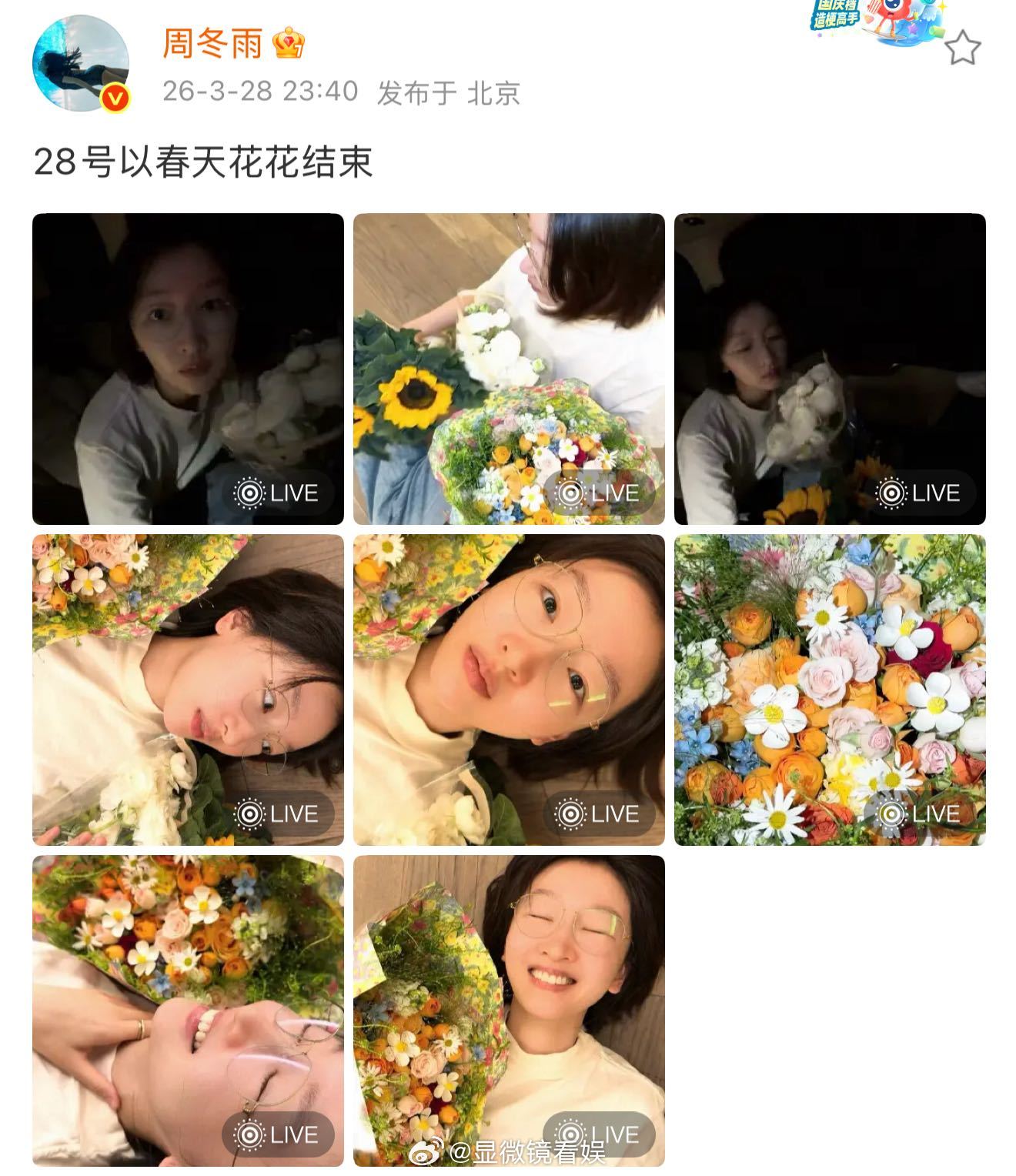 周冬雨和粉丝送的花合影 这组素颜照好看诶,落地北京被粉丝送了美丽的花花,抱着就是框框出图,清新又很有少年感,姐最近的状态真的很绝了~周冬雨28号以春天花花结束