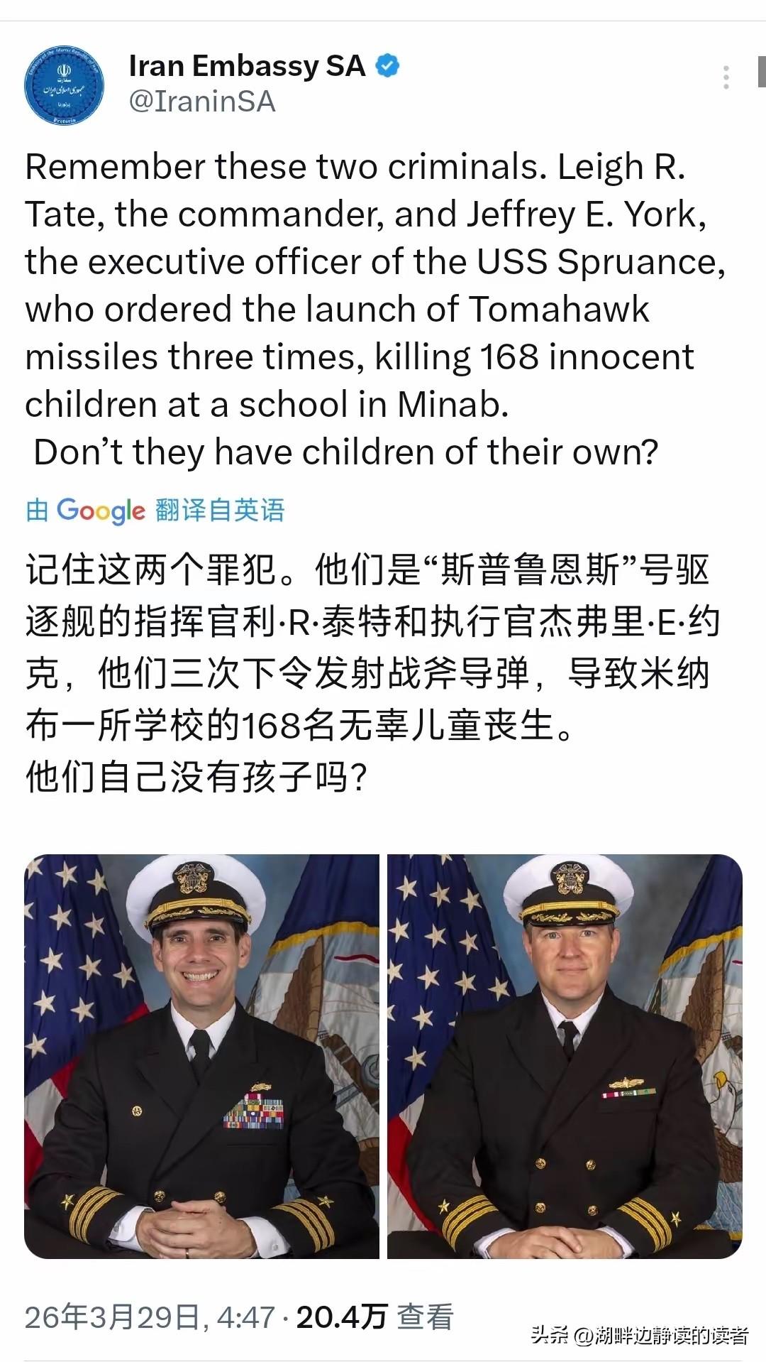 伊朗驻南非大使馆今天(北京时间3月29日)写道:“记住这两个罪犯。他们是‘斯普鲁恩斯’号驱逐舰的指挥官利·R·泰特和执行官杰弗里·E·约克,他们三次下令发射战斧导弹,导致米纳布一所学校的168名无辜儿童丧生。他们自己没有孩子吗?” 米纳布这所女子小学的遇难者多为6至12岁女童,教学楼被战斧导弹直接击穿坍塌,救援人员在废墟中只找到残缺的遗体与散落的课本,现场惨状令人心碎。 伊朗官方已公布导弹残骸序列号与卫星打击轨迹,铁证锁定美军“斯普鲁恩斯”号为袭击实施方,所谓情报失误的说辞根本站不住脚。 美国军方仅以过时坐标、误击民用设施敷衍回应,从未对168条幼小生命道歉,更未启动对两名指挥官的任何追责程序。 联合国人权理事会上,多国代表齐声谴责这一突破人类道德底线的战争罪行,要求美以立即停止对伊朗民用目标的打击。 中国代表明确发声,指出此次校园袭击严重违反国际人道法,是对基本人权的粗暴践踏,必须追究相关人员责任。 伊朗全国多地为遇难儿童举行集体葬礼,民众手持白花走上街头,抗议美军暴行,要求为逝去的孩子讨回公道。 伊朗革命卫队已将利·R·泰特与杰弗里·E·约克列入军事打击清单,后续将对这两名战争罪犯实施精准报复。 战斧导弹单价超150万美元,美军用昂贵武器屠戮手无寸铁的学童,所谓人权卫士的虚伪面具被彻底撕碎。 阿联酋、沙特等海湾国家纷纷改口,不再附和美国对伊强硬论调,害怕类似悲剧在本国境内上演,地区反美情绪持续高涨。 遇难儿童中最小的年仅5岁,距离8岁生日仅两天,本该享受童年的生命,永远定格在美军导弹袭来的瞬间。 伊朗教育部门数据显示,本轮美以空袭已造成伊朗230余名儿童死亡,近千所学校受损,下一代成长环境惨遭破坏。 美国国内反战人士发起游行,高举“停止杀害儿童”的标语,要求政府结束中东战事,为校园惨案承担责任。 伊朗驻全球使领馆同步转发两名美军指挥官信息,发动国际舆论声讨,让战争罪行在全世界面前无处遁形。 以武力欺凌弱小、屠戮平民的行径终将被历史唾弃,美军此次犯下的反人类罪行,会永远钉在文明社会的耻辱柱上。伊朗遇袭事件 伊朗华人撤离 伊朗紧急撤侨 德黑兰紧急事件 麻烦看官老爷们右上角点击一下“关注”,既方便您进行讨论和分享,又能给您带来不一样的参与感,感谢您的支持! 各位读者你们怎么看?欢迎在评论区讨论。
