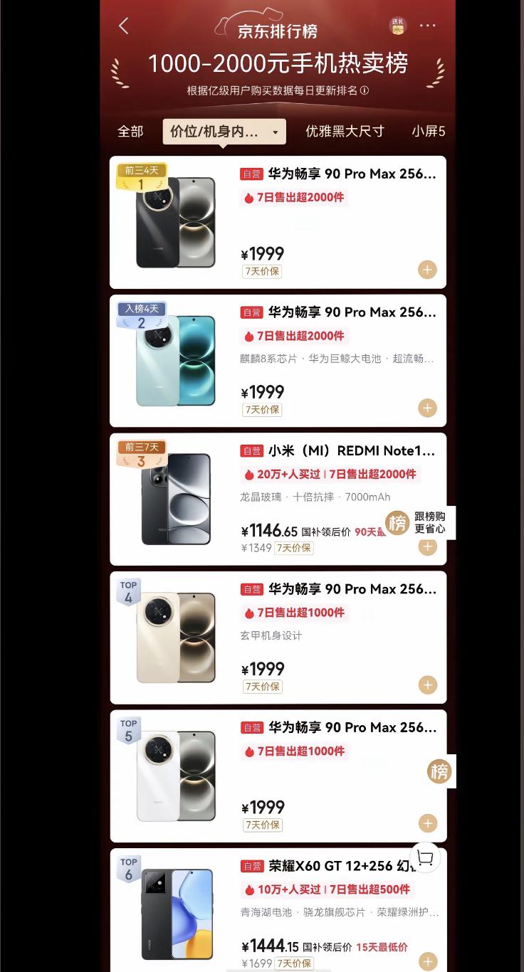 华为的回归实在是太猛了!京东1000~2000元手机销量排行榜,华为畅享90 P