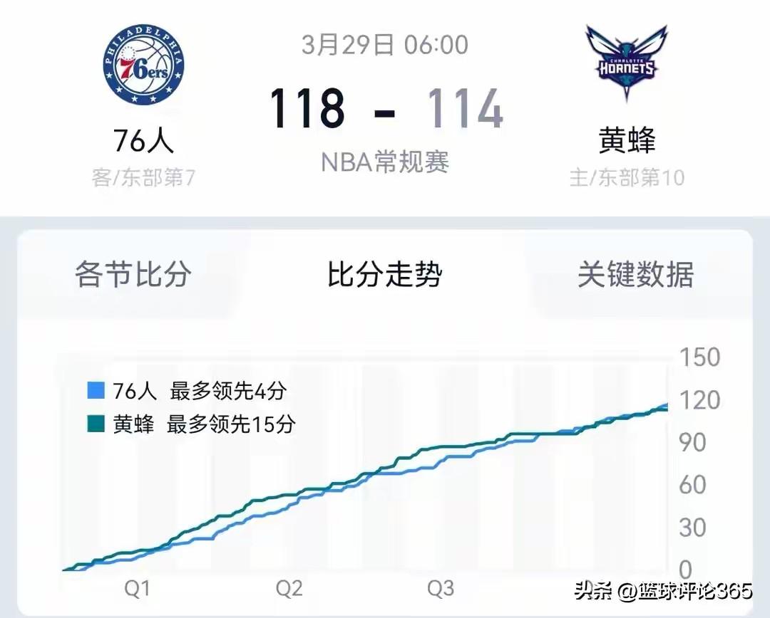 76人骗了全联盟,亮家底打出赛季最佳一战,距离第5仅差0.5胜场差: 3月29日,NBA常规赛迎来一场关键卡位战。费城76人客场挑战夏洛特黄蜂,在一度落后的不利局面下,凭借末节的强势反弹,最终以118-114逆转对手,收获两连胜。 本场比赛堪称76人本赛季的“代表作”之一,尤其体现在核心阵容的爆发上。伤愈复出的恩比德状态火热,全场贡献29分6篮板;马克西则展现了全能身手,砍下26分7篮板8助攻的准三双数据;保罗·乔治同样稳定输出,得到26分13篮板的两双。三巨头合力轰下81分,攻防两端均打出了久违的统治力。 比赛过程跌宕起伏。黄蜂队在上半场凭借精准的外线投射一度占据主动,但76人在第四节加强了防守强度,单节净胜对手11分,最终完成逆转。黄蜂方面,尽管米勒得到29分,鲍尔20分8助攻,但全队三分线外55投仅17中,关键时刻命中率下滑成为落败主因。 此役过后,76人战绩提升至41胜33负,继续稳固东部第7的位置。值得注意的是,他们距离东部第5的猛龙仅差0.5个胜场,第6名老鹰正在与国王激烈交战中,如果老鹰取胜,76则排名第7,落后猛龙和老鹰0.5个胜场差;如果老鹰不敌国王,76人则可以升至第6名,季后赛门票争夺战已进入白热化阶段。 对于76人而言,第7名显然不是终点。随着三巨头齐全,球队完全有能力在常规赛收官阶段向更高排位发起冲击,这支攻守均衡的球队将是东部季后赛不可忽视的力量。