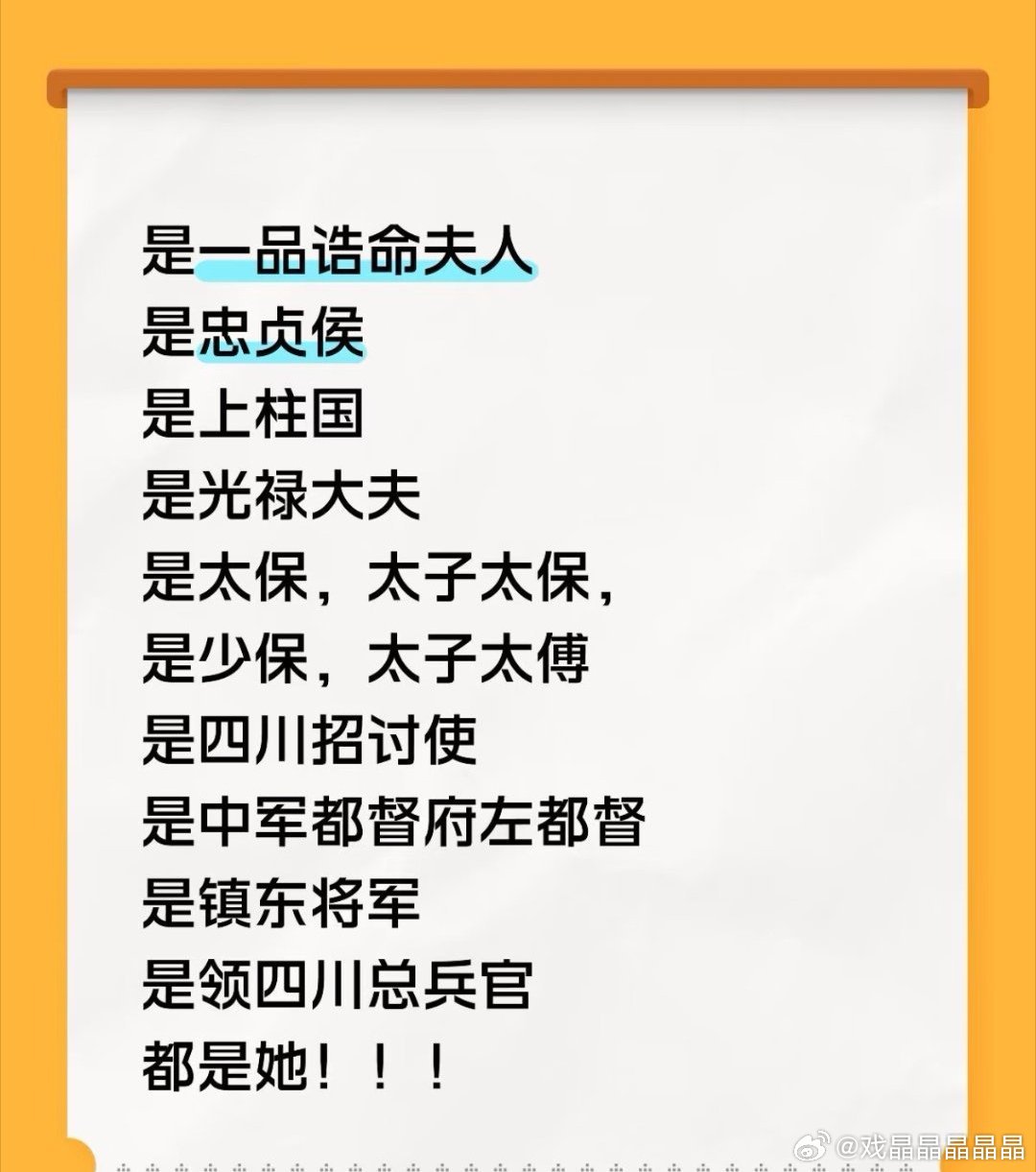 她是一品诰命夫人是忠贞侯是上柱国是光禄大夫是太保,太子太保,是少保,太子太傅是四川招讨使是中军都督府左都督是镇东将军是领四川总兵官!