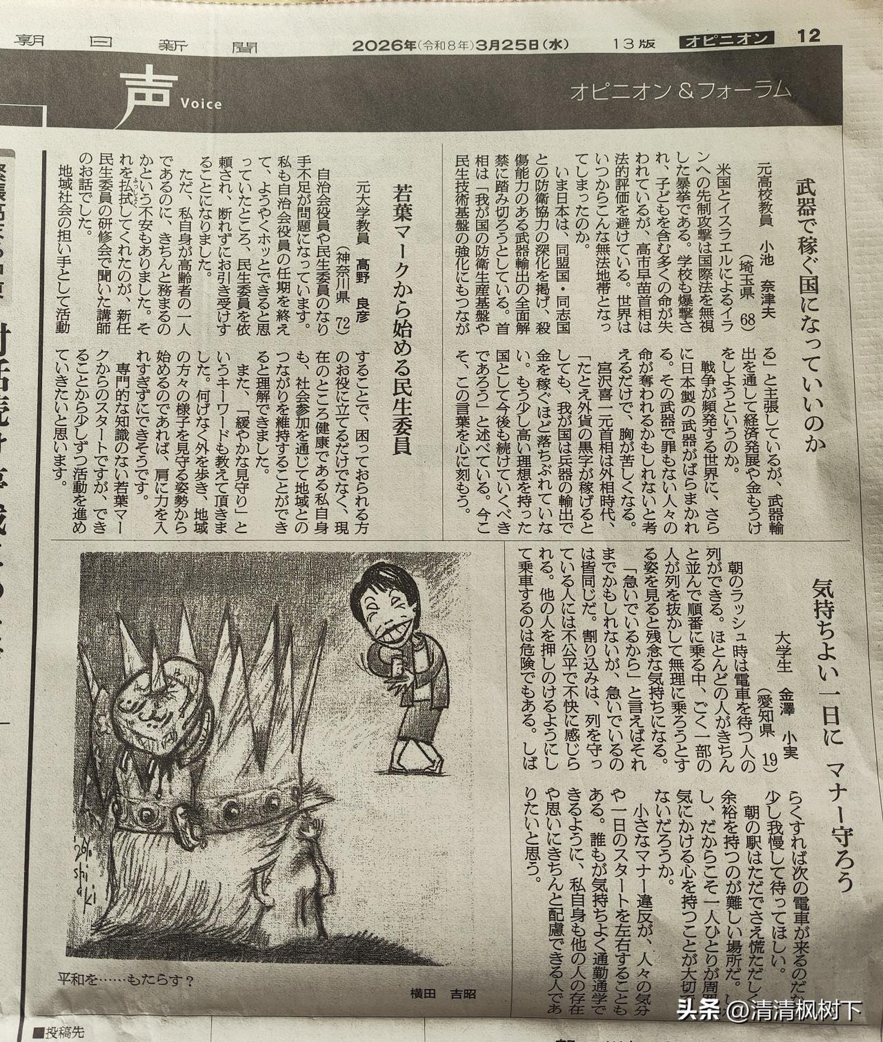 攒了一周的日本朝日新闻报纸,周末认真读一读。3月25日的观点栏目,有一位退休高中老师的文章让我印象深刻。