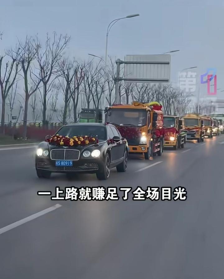 3月28日安徽淮北,95后“掏粪男孩”潘浩男大婚,直接用9辆吸粪车加6辆轿车组成迎亲车队,一路浩浩荡荡,回头率直接爆表,场面又霸气又好笑。 谁能想到,这个干着掏粪活的小伙,居然是科班影视编导出身,后来子承父业当起了“掏二代”。他上班就带着工人开粪车跑一线,不怕脏不怕累,下班就开着奔驰回归生活,反差感拉满。 面对别人的眼光,他一点不避讳,直言自己干的是最脏最臭的活,挣的是最干净、最踏实的钱。如今他娶到了自己心爱的姑娘,新娘也十分支持他的事业,满眼都是爱意。 不靠颜值不拼背景,凭双手努力生活,还收获了美满爱情,这才是真正的人生赢家。祝福这对新人新婚快乐,永远幸福!