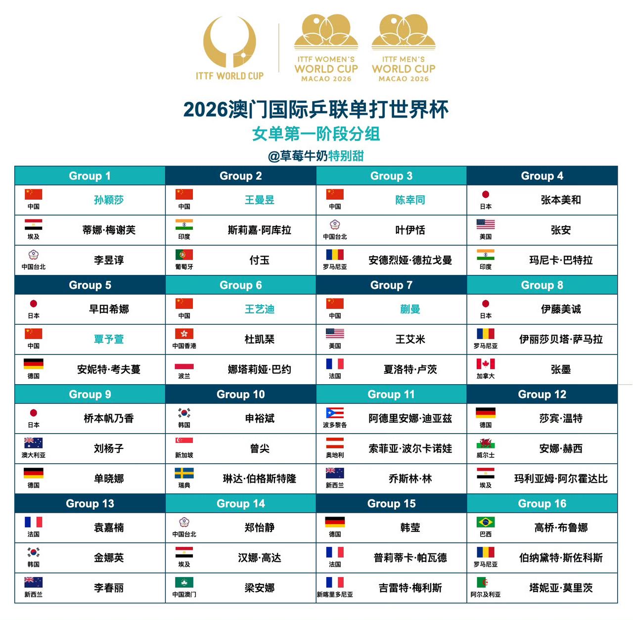 孙颖莎的小组对手分别是缇娜•梅谢芙和李昱淳。