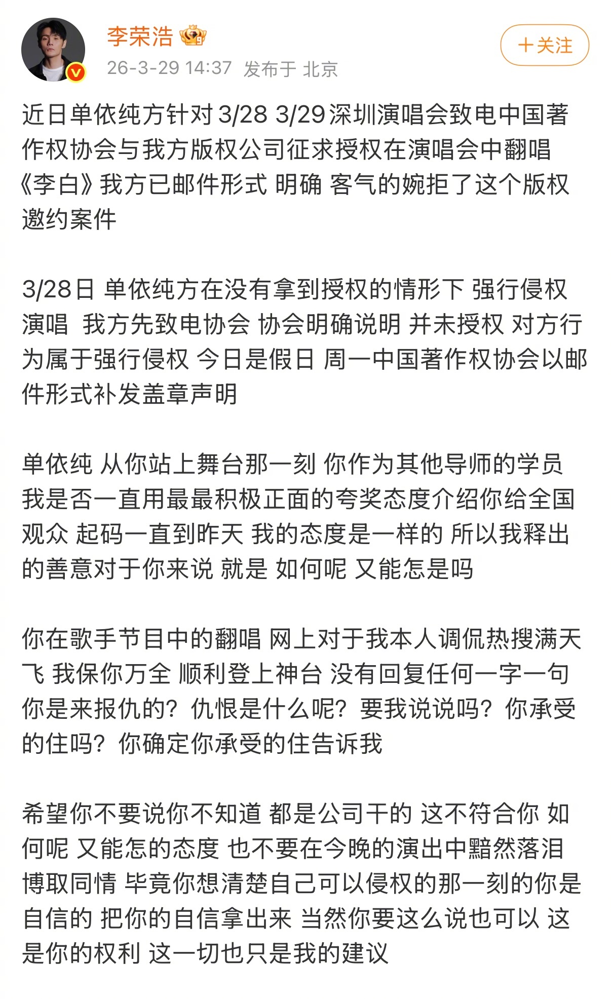 李荣浩发文控诉单依纯,翻唱没获得许可啊!终于可以说了,她毁了李白,完全是毁人家作
