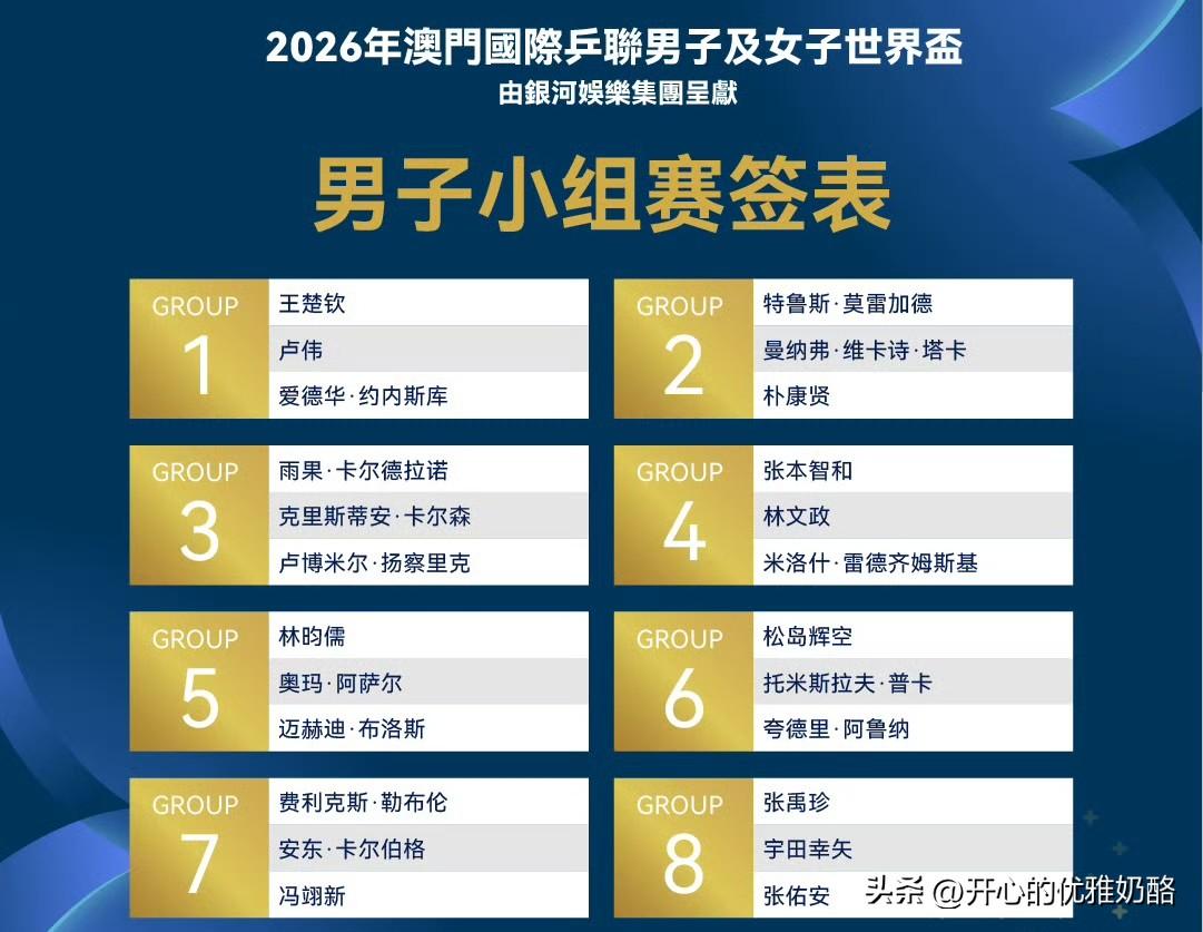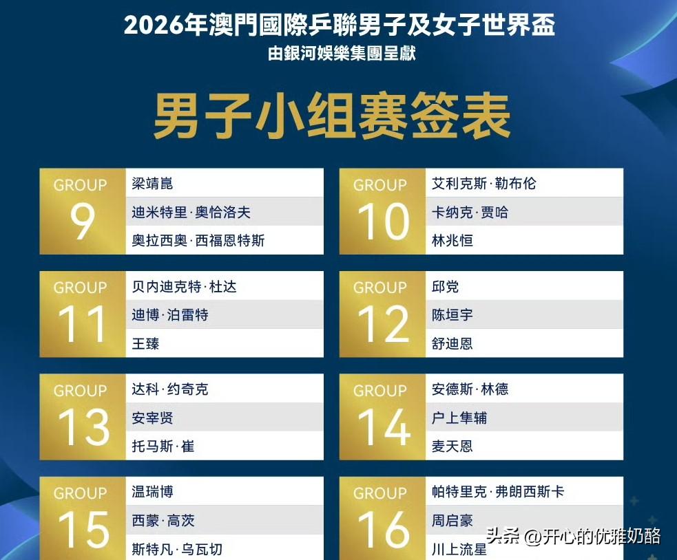 男单抽签结果发布,温瑞博和陈垣宇想出线有难度。 男队只有王楚钦在第一组,其他四个人分到第九组以后。 正是因为分在后面组,男队才因祸得福。 梁靖崑分在第9组,陈垣宇第12组,温瑞博笫15组,周启豪第16组。 众所周知实力强都在前8组,分到后面的相对实力都差不多,这样反而晋级的可能性大。 温瑞博VS西蒙,陈垣宇VS邱党 ,两个小将的签很硬,但愿能持续强势,能先晋级就很棒了。 当然16进8一定会有淘汰,但愿淘汰赛内战少一点,男队争取多打几轮。 加油中国队,男单一定要支棱起来。 图片来自网络侵权可删。