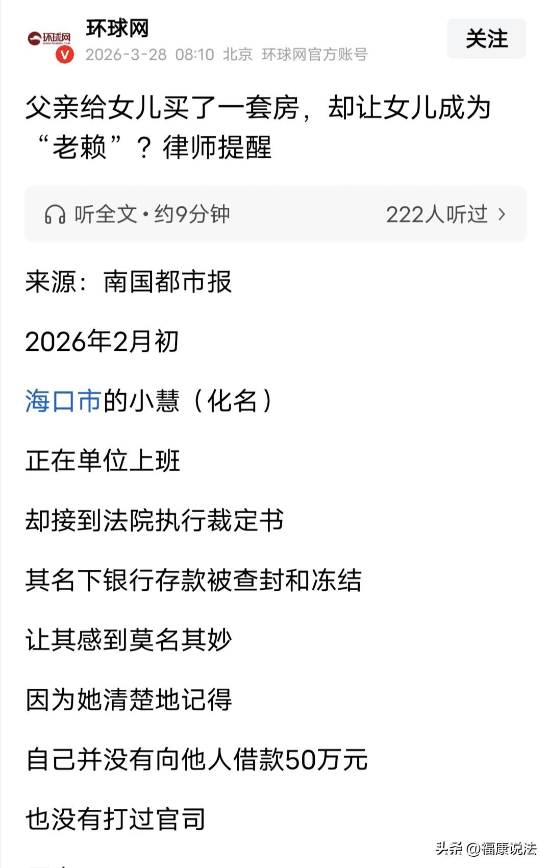 “这爹是真坑闺女啊!”海南海口,女子收到一条短信银行存款被查封、冻结,说她欠50万不还,她懵了:我没借钱,为何成被执行人?去查问,才知父亲把曾给她买的房抵押借了50万,还不上钱后,伪造她签名,法院送达文书也被其代收。甚至还跟法院说:我女儿没电话、找不到人。最终,法院判决女子还款。女子莫名成了“老赖”,她寻找多方帮助,终于看到一丝希望。 小慧本来日子过得安安稳稳,可2026年春节前的一天,她正上班呢,突然收到一条银行短信,银行卡里的钱被查封和冻结了,她一下懵了。 小慧一头雾水,自己没借过钱、没打过官司,怎么就成被执行人了? 她赶紧去银行、跑法院,一查问才知道:自己被判决要还50万借款,可到期没还,法院直接查封冻结了她的账户。 这下小慧彻底崩溃了,自己压根没借过钱,更不可能借50万,到底怎么回事? 原来,这事儿全是她爹老富搞出来的。 几年前,老富出钱给女儿买了套海口的房子,房产证上写的是小慧和一个叫王某的女人共有。 后来老富生意周转不开,想卖房子,小慧怀疑老爹和王女士关系不正常,死活不肯签字卖房。 老富需要钱,一着急,瞒着女儿,拿着她的身份证,以小慧的名义跟人签了50万的借款合同,还把这套房子抵押了出去。 而且,合同上小慧的签名,都是老富代签的,出借人也没亲眼见过小慧签字。 法院后来给小慧寄开庭通知,全被老富签收了,还跟法院说“小慧没电话、找不到人”。 法院以为小慧下落不明,就公告送达、缺席审判,直接判小慧败诉还钱。 等小慧发现时,判决都生效快一年了,自己莫名其妙背上50万债,成了“老赖”,工资卡、银行卡全被冻住,生活彻底乱了套。 这事一出,老富整的还挺委屈,他说自己是为了做生意,没想害女儿,自己还凑了5万现金给女儿补窟窿,可那50万的大坑,哪是这么容易填上的。 这事到底谁的锅?从法律角度怎么说? 第一,小慧根本不用背这锅。 《民法典》第171条规定:行为人没有代理权、超越代理权或者代理权终止后,仍然实施代理行为,未经被代理人追认的,对被代理人不发生效力。 因为,合同上的签名是假的,借款合同对小慧无效。 老富伪造小慧签名签借款合同、办抵押,属于无权代理,并且伪造证据。 小慧从头到尾不知情、没追认,这合同对她就没法律效力,50万她不用还。 通俗的说:小慧的父亲在没有得到小慧明确授权、事后也没被小慧认可的情况下,擅自以小慧的名义签订借款协议、办理房屋抵押,这些行为在法律上对小慧本身是不产生约束力的,小慧本不该为这笔自己不知情的债务承担还款责任。 第二,法院没找到小慧本人,只听老富一面之词就公告送达、缺席判,程序明显错了。小慧可以在知道这事起6个月内,向上级法院申请再审,要求撤销原判、改判自己不用还钱。 第三,房子登记在小慧名下,她是产权人,没同意抵押,这抵押对她无效,房子不能被随便拿去抵债 。 后来,小慧只好找了记者、居委会等多方帮忙。 据了解,3月26号,小慧表示,她愿意把房子产权交给父亲老富处理,而老富也承诺自己扛下50万债务。 现在老富正跟出借人、法院沟通,想先解封房子卖掉还钱,再给小慧解除“老赖”身份。 有人说,房子是父亲一人购买,卖掉无可厚非,但从亲情上说,父亲有点过了。 说到底,老富这份父爱却用错了方式,他忽略了最关键的一点。 房产登记在女儿名下,女儿就是独立的产权人,哪怕他是出资人,也没有权利私自处置女儿的财产,更不能冒用女儿的名义让其背负债务。 而小慧从抗拒卖房到最后愿意让出产权帮父亲解决债务,也是出于血脉亲情的妥协。 这件事也给所有家庭提了醒,亲情再亲,也不能无视法律规则和他人的合法权利,不能用“为你好”“我是长辈”当做越权行事的借口,否则既会伤了家人感情,无法挽回,最终落得两败俱伤的局面。 人物化名,图片来源于网络