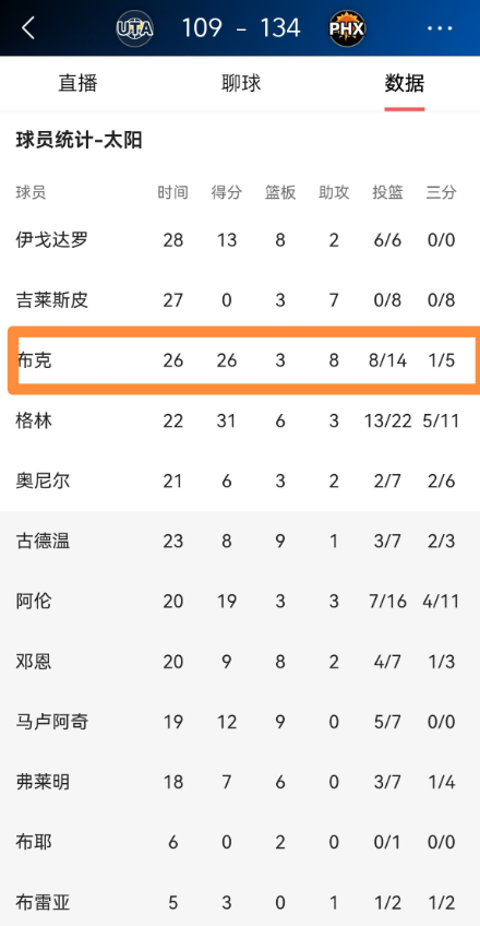 整场比赛下来,布克首发出战26分钟,投篮14中8,其中三分球5中1、罚球10中9得到26分,还有3篮板8助攻1抢断1盖帽,他的场上正负值为+21。