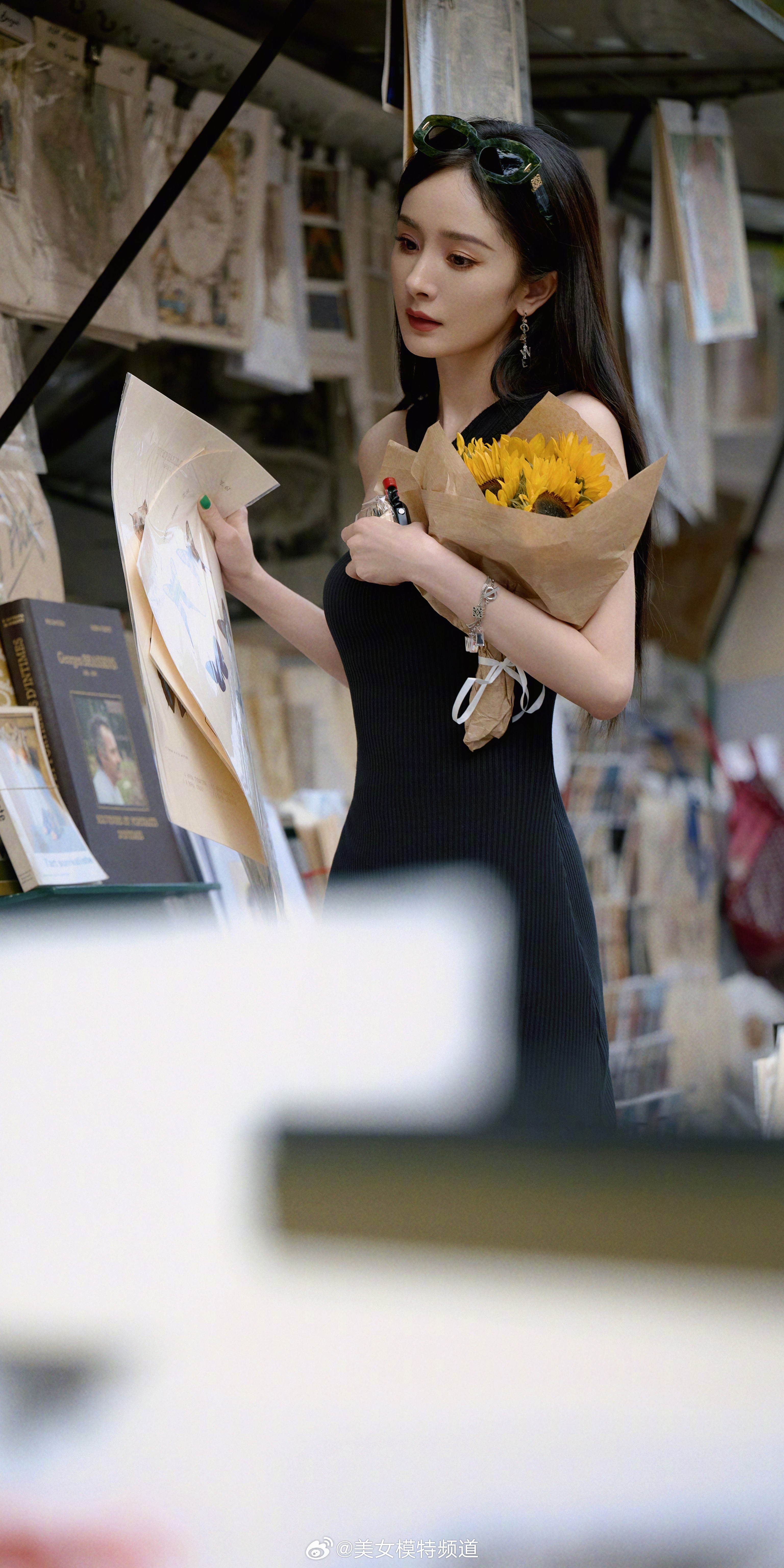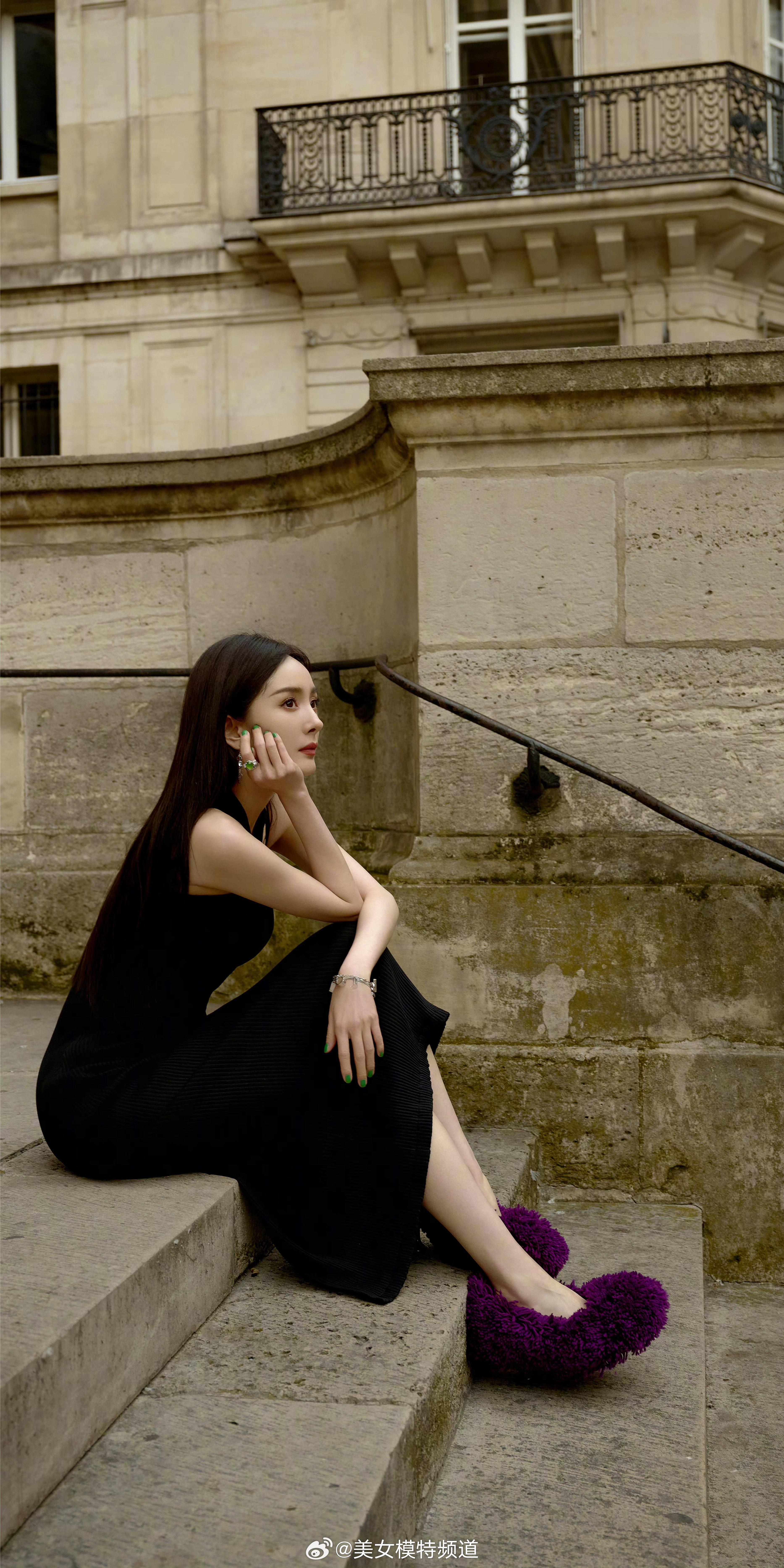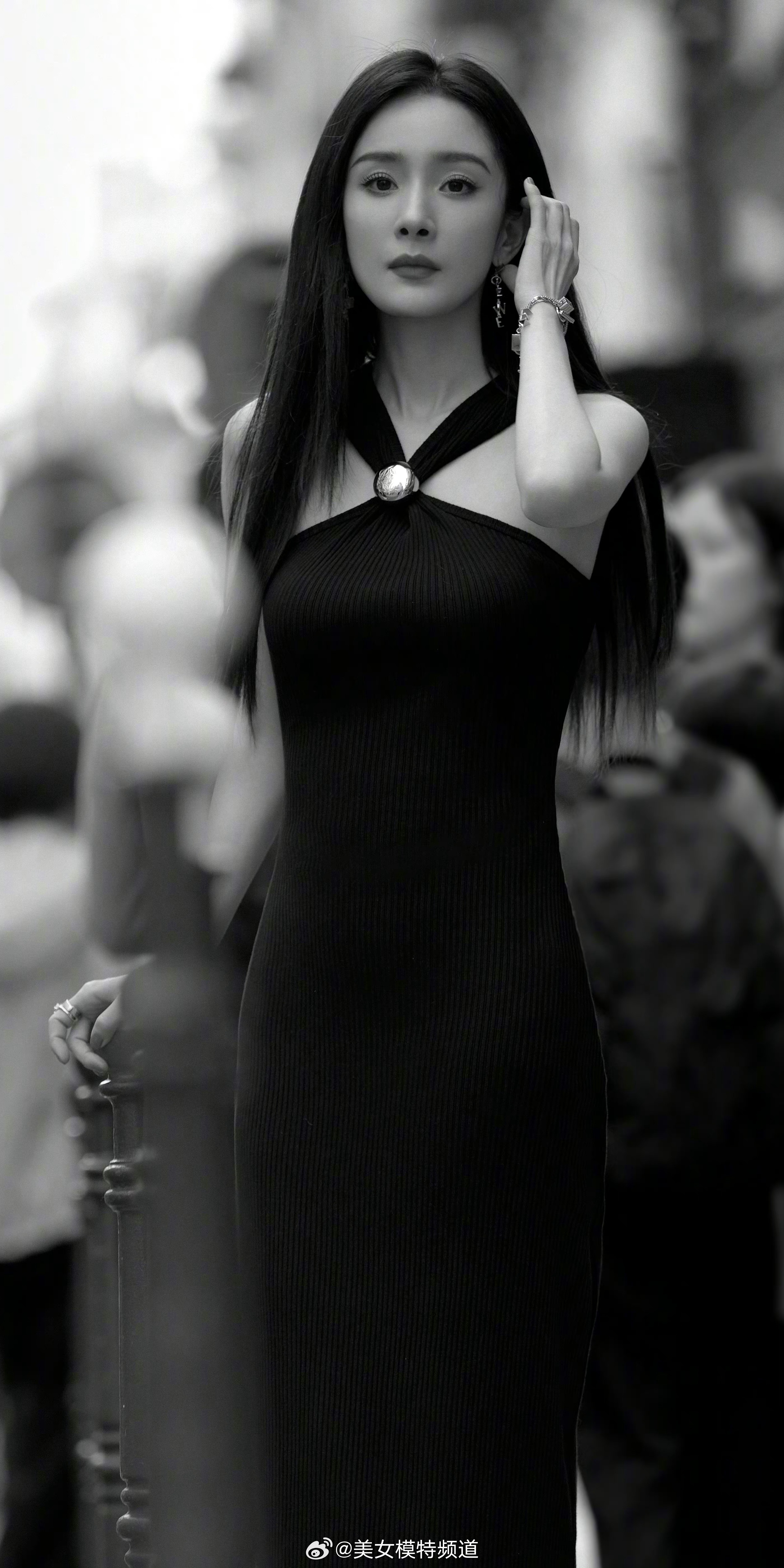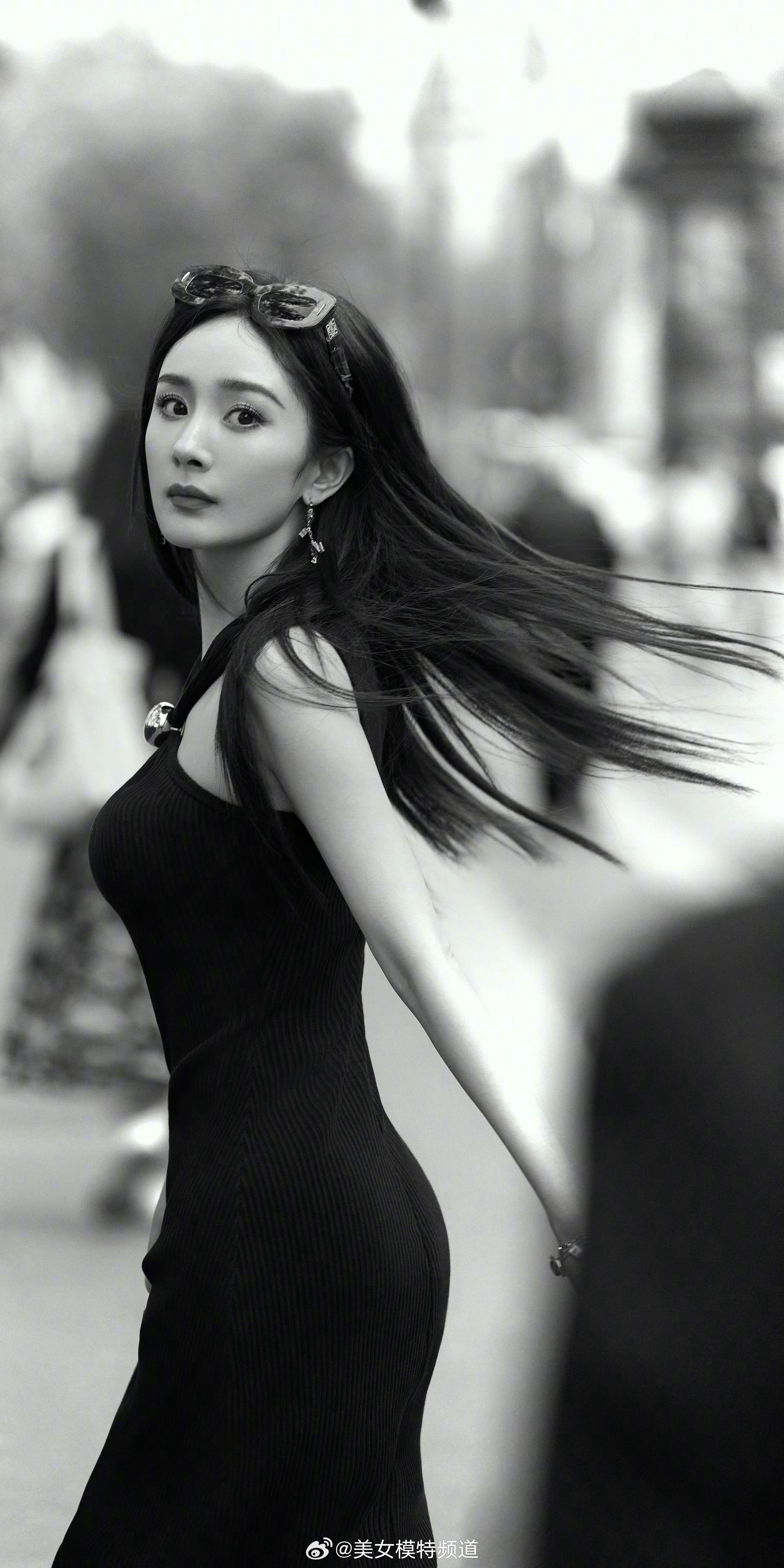 杨幂巴黎漫步黑色挂脖裙