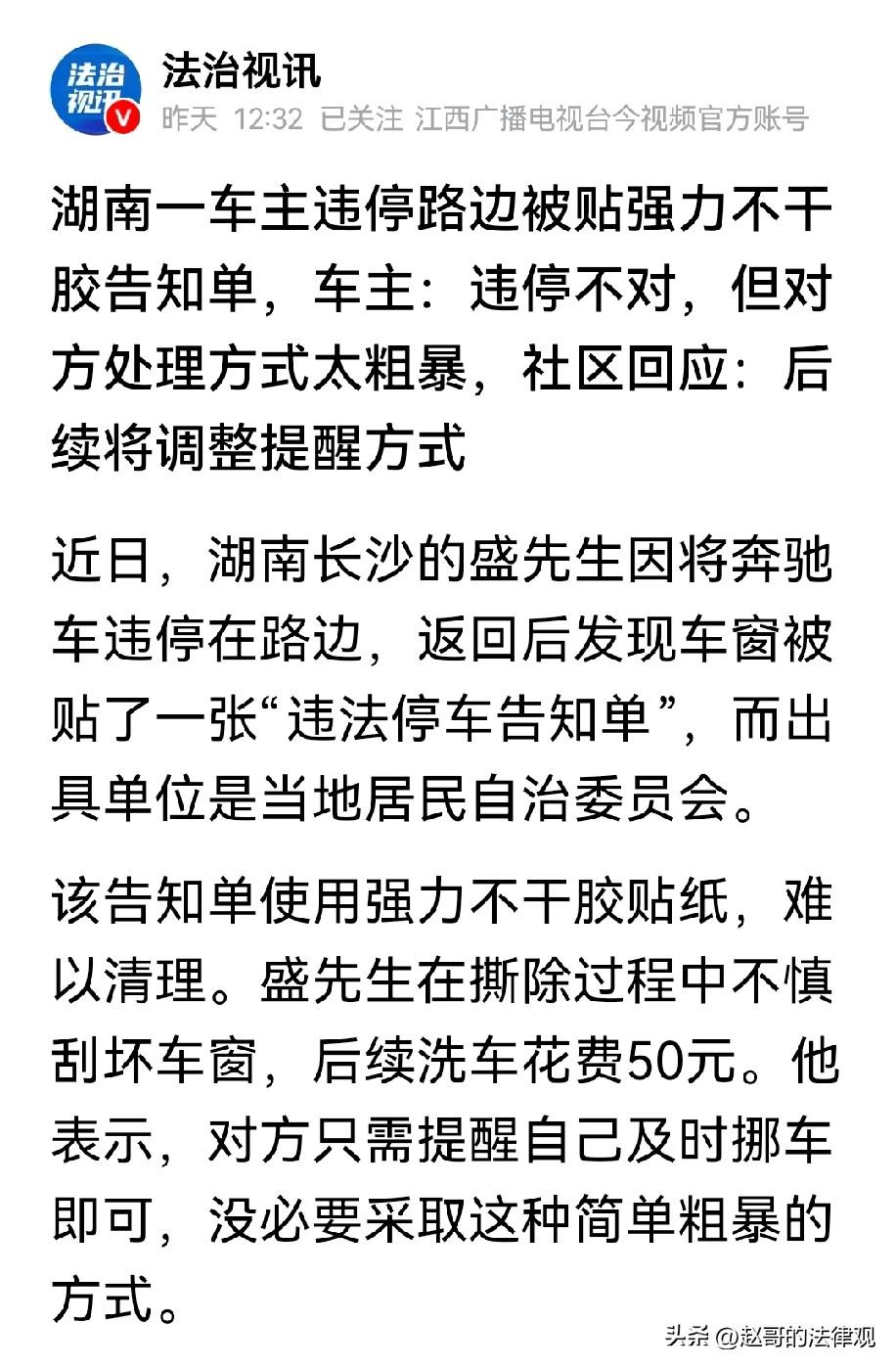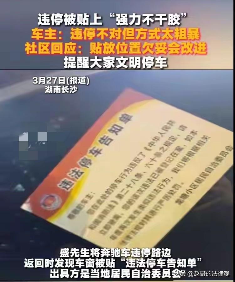 豪车就可以乱停?湖南长沙,男子将奔驰车停在路边,开车时发现,车窗被居委会贴了一张“违停告知单”。男子要去办事,就想撕下那张单子,不料,单子使用了强力不干胶贴纸,在撕除时不慎刮坏车玻璃,留下了不可去除的划痕。他找居委会理论,对方一句话,让男子无法接受。 3月18号那天,盛先生开着刚买不久的奔驰车,去某街道办事,一时没找到车位,就把车停在了路边。 等他回来,主驾驶车窗上多了张“违法停车告知单”。 原本以为是交警贴的,结果仔细一看,落款居然是某小区居民自治委员。 盛先生这辆车是新买的,平时格外爱惜。 他看到车窗上贴的那张单子,第一反应是自己违停了,认了,该罚款罚款。 可等他想把单子揭下来时,才发现事情没那么简单。 那层不干胶,像是长在了玻璃上,他试着撕了一下,只撕下来一层纸皮。 底下那层胶牢牢扒着玻璃,纹丝不动。 盛先生气的不行,你提醒一下,说碍事了,我立马挪走就是了。 或者你放张纸,说这里不能停车,我也能接受。 哪怕是交警贴罚单,我也能接受,但不能用这种方式。 盛先生当时急着开车去办事儿,那张纸正好贴在主驾驶左侧视线位置,挡着看后视镜。 他一着急,伸手想把纸彻底抠下来,结果留下几道痕迹。 最后实在没办法,他只好先开车去办事。 第二天,他专门找了家洗车店,花了50块钱,让人用专业工具清理。 胶是弄掉了,可玻璃上还是留下了划痕印。 洗车店的人告诉他,这痕迹已经渗进去了,要彻底解决,得把整块玻璃的贴膜换掉。 真正让他觉得别扭的,还不只是这点损失。 他仔细看了看那张告知单,上面的措辞很正式。 单子上写着:“如本年度再次发生类似违法行为,将依据相关法律法规予以严厉处罚”。 这口气,怎么看都像是执法部门的口吻。 可盖的章,却是“某小区居民自治委员会”。 这个委员会是啥单位?谁给他的权利,往车主的车上贴罚单贴? 盛先生也承认自己违停不对,但一个居民自治组织,凭什么用这种执法部门的语气? 而社区负责人说,这里是安置小区,情况特殊,一共92栋房子。 周边还有幼儿园、小学、中学,一到上下学时间,车子更是挤成一锅粥。 停车难,违停多,居民意见很大。 去年社区牵头,组织小区居民自治委员会的人,轮流在高峰时段执勤,对乱停乱放的车子进行劝导,发放告示提醒。 盛先生的车,就是停在了主干道上,正好被巡到的人给贴了。 负责人也承认,这个方式确实有问题。 首先是贴的位置不对,正好挡了驾驶员看反光镜,有安全隐患。 其次,工作人员当时可能光想着怎么把提醒贴结实,没考虑不干胶撕下来会这么费劲。 负责人态度诚恳:“确实是我们做得不对。” 并承诺后续会调整提醒方式,先试着打电话通知车主挪车。 如果联系不上,或者情况紧急,就用小卡片夹在挡风玻璃上,不再用不干胶直接贴。 至于盛先生车玻璃的损失,社区会协调商量解决。 事情其实很清楚:盛先生违停在先,尤其是堵在人多车多的小区主干道上,确实影响了别人。 另一方面,自治委员会的初衷,是维护秩序,但手段太过粗糙。 一没执法权,二用强力胶,三是措辞越界,硬生生把自己从一个劝导者,变成了处罚者。 违停确实该管,问题是管理的方式。 依据《道路交通安全法》第九十三条:对违反道路交通安全法律、法规关于机动车停放、临时停车规定的,可以指出违法行为,并予以口头警告,令其立即驶离。 机动车驾驶人不在现场或者虽在现场但拒绝立即驶离,妨碍其他车辆、行人通行的,处20元以上200元以下罚款。 并可以将该机动车拖移至不妨碍交通的地点或者公安机关交通管理部门指定的地点停放。 公安机关交通管理部门拖车不得向当事人收取费用,并应当及时告知当事人停放地点。 因采取不正确的方法拖车造成机动车损坏的,应当依法承担补偿责任。 也就是说,只有公安机关交通管理部门、及其交警,才有权力对违法停车进行处罚。 处罚方式,包括口头警告、罚款、拖车等。 盛先生违停,理应接受处罚,但处罚主体,应是交警等法定执法人员。 小区居民自治委员会,没有执法权,还因不当贴单方式,导致盛先生车辆受损,构成了侵权。 但也有网友认为,路边随意乱停车就是不对,跟他讲道理,他就耍无赖。 别人也跟他耍无赖的时候,他就开始装无辜,要维权了。 对此你怎么看呢?
