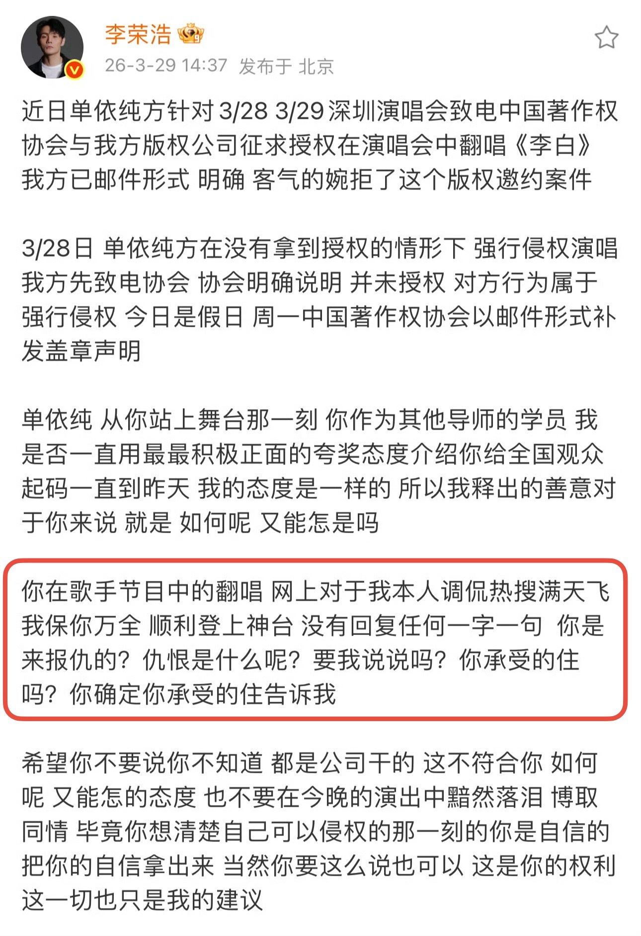 李荣浩转发回复吴向飞李荣浩望您明示李荣浩直接转发回复了吴向飞的喊话:1.询