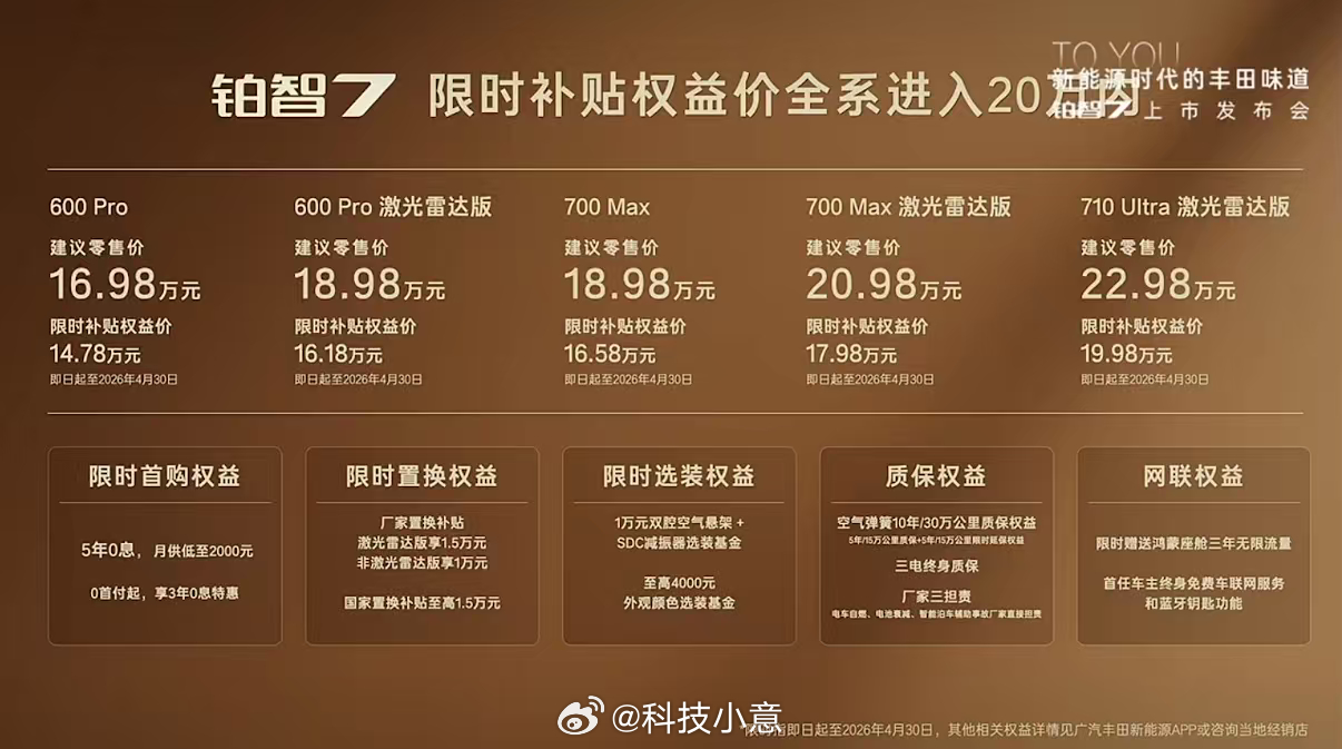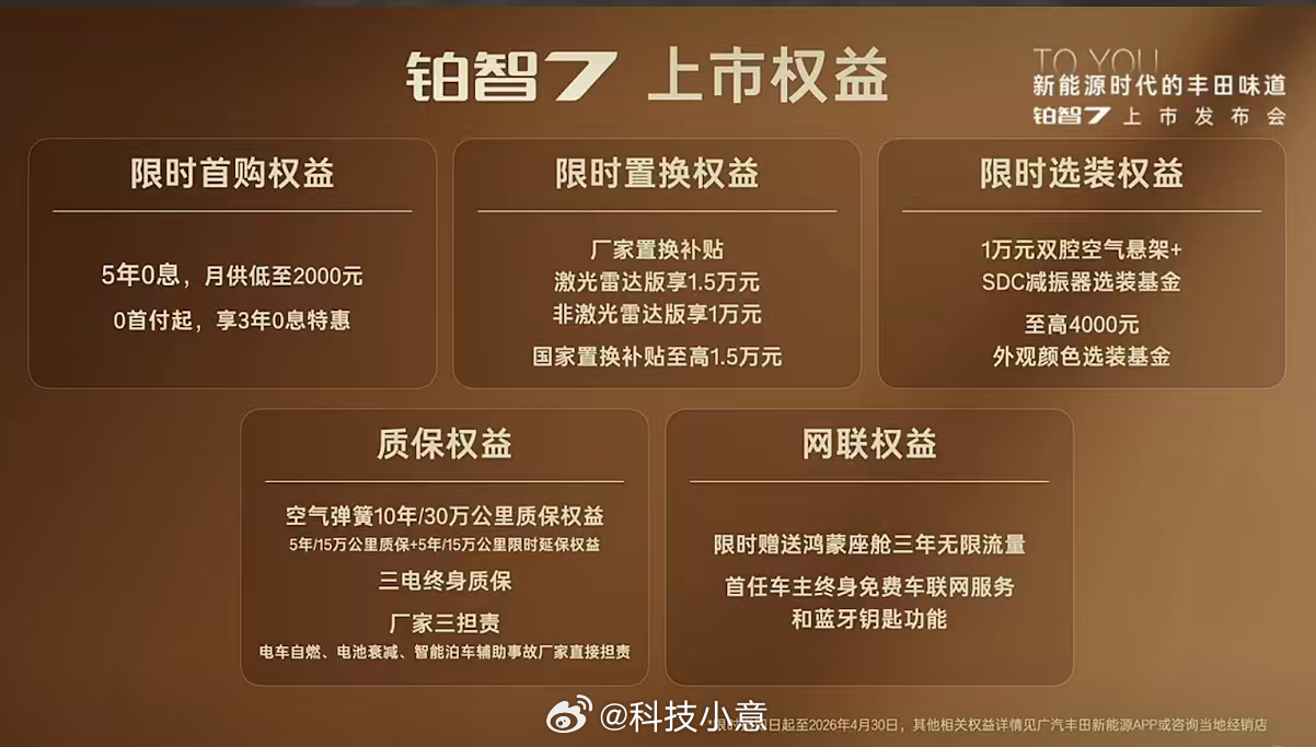 再加上各种权益,这价格确实挺香的,想入手的赶紧冲了!丰田铂智7定档3月29日上市