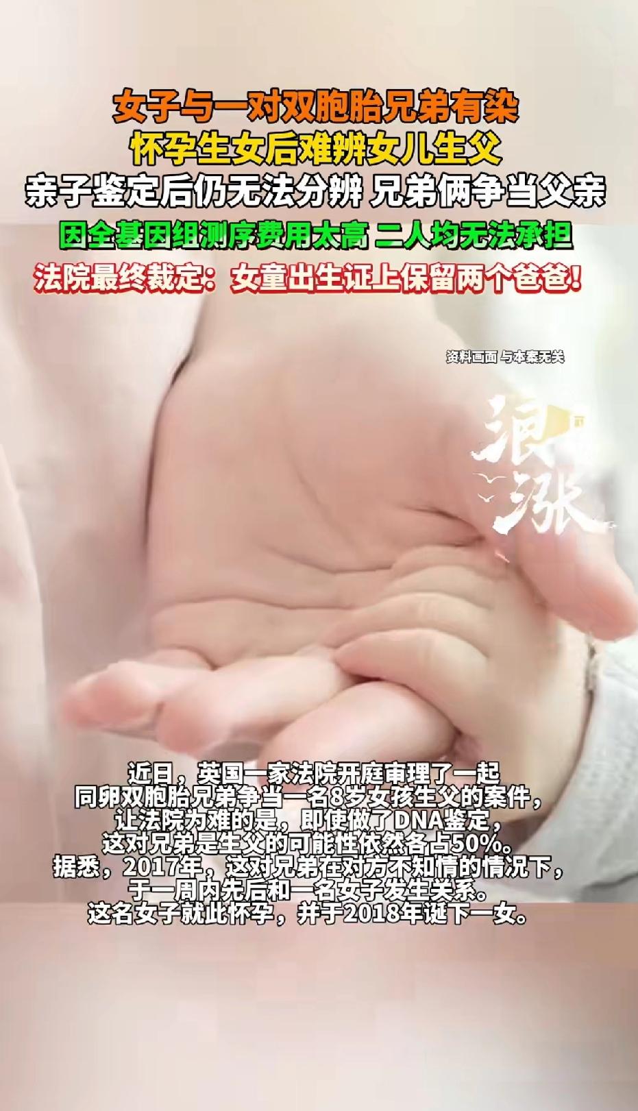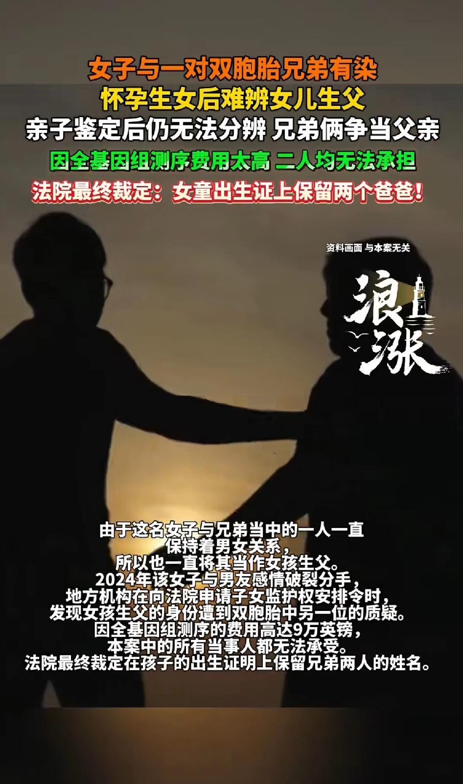 女子与一对双胞胎兄弟有染,怀孕生女后难辨女儿生父,这事儿可太抓马了!一个英国女子和双胞胎兄弟有染,结果怀孕生女后,连孩子生父是谁都搞不清。 这剧情简直比电视剧还精彩。一般的亲子鉴定,在双胞胎这儿就失灵了,因为他们基因太相似。 亲子鉴定后仍无法分辨谁是孩子的亲生父亲,因基因组测序费用太高二人均无力承担,为此兄弟俩争当孩子父亲。 法院最终裁定:女童出生证上保留两个爸爸。 想象一下,这女子之后的生活得多混乱,两个兄弟可能也会为此扯皮。孩子成长过程中,面对这种复杂的家庭关系,也会有诸多困扰。这真给大家提了个醒,感情生活还是得慎重,不然像这样整出个“罗生门”,可就麻烦大了。