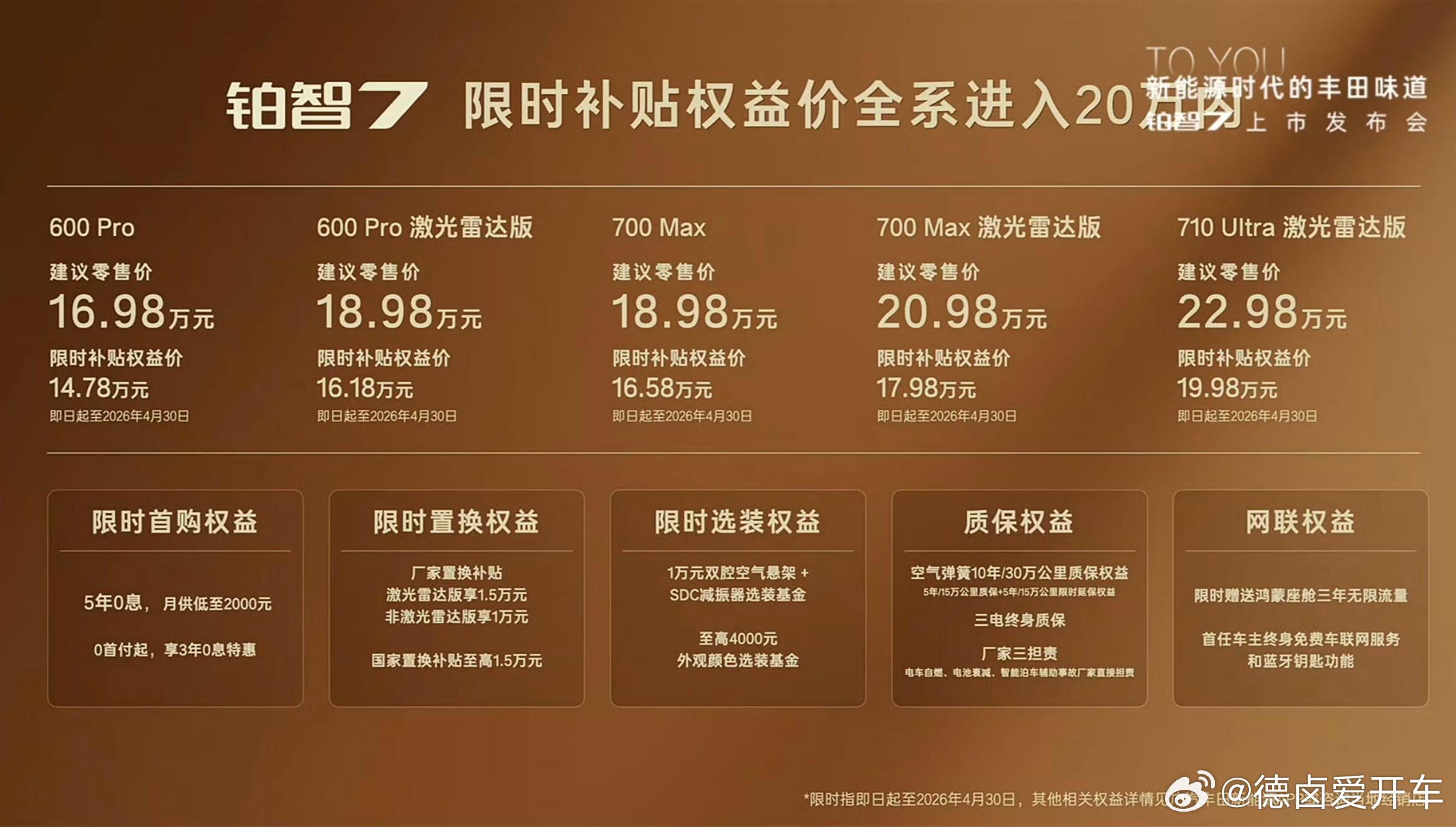 广汽丰田铂智7上市权益价14.98万-19.98万!铂智7如此的产品力和价格权益