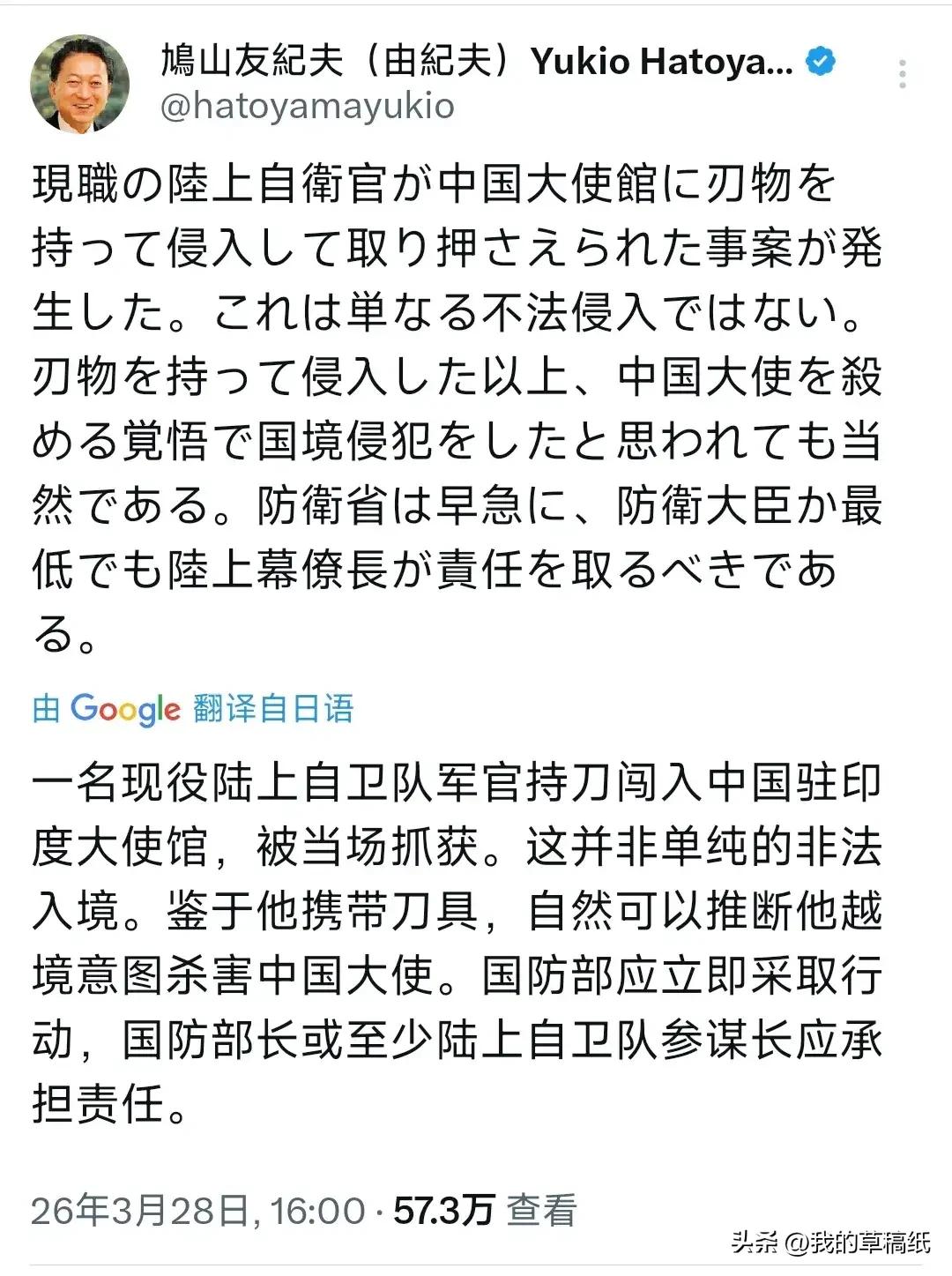 闯馆6天日方仍拒道歉,搜查只是做样子?背后疑点藏不住! 持刀闯中国使馆的闹剧过去快一周,日方的操作,越看越让人心里打鼓。 3月24日,23岁日本陆上自卫队三等陆尉村田晃大,携带18厘米刀具翻墙闯入中国驻日使馆,公然扬言杀害外交人员,行为极端且恶劣。直到3月29日,日本警视厅才对其部队驻地与住所展开搜查,看似推进调查,更像是走个过场。 整件事过去五六天,日方的态度始终耐人寻味。从头到尾只轻飘飘一句“遗憾”,正式道歉、对涉事部队的问责一概不提,面对中方的严正交涉,全程用“仍在调查”搪塞。 按照《维也纳外交关系公约》,日本本应全力守护使馆安全,如今连基本的责任都不愿承担。这很难不让人质疑,一名现役自卫队员预谋跨城、带刀闯馆,背后是否藏着更多不为人知的内情? 中方多次要求彻查严惩、给出负责任的交代,日方这般避重就轻,不仅违背国际义务,更在不断消耗两国互信,这份敷衍,终究没法蒙混过关。