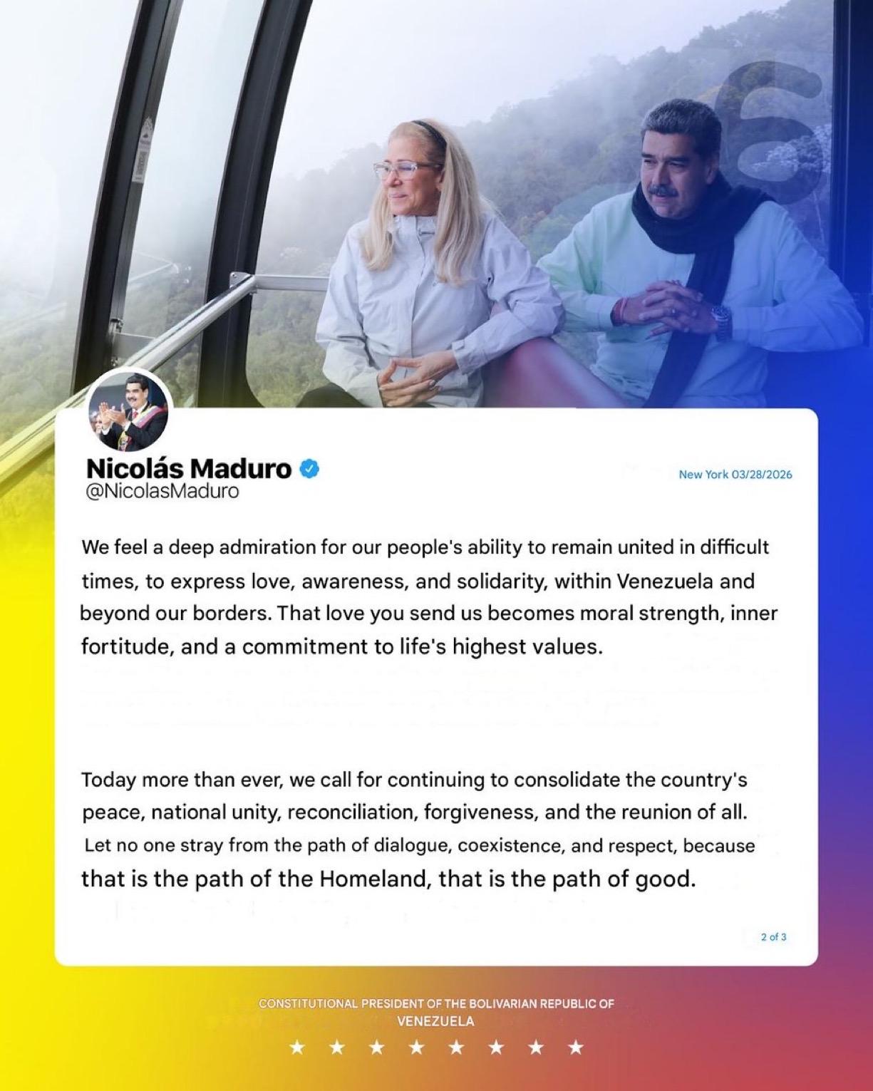 被关在美国监狱的委内瑞拉总统尼古拉斯·马杜罗和他的妻子西莉亚·弗洛雷斯首次向委内瑞拉人民发表讲话,感谢他们的支持: “我们一切安好,意志坚定,内心平静,并持续祈祷。” “你们给予我们的爱化作了道德力量。我们呼吁继续巩固委内瑞拉的和平、团结、和解、宽恕以及全民团聚。” “我们深深钦佩我国人民在困难时期保持团结的能力,以及在委内瑞拉乃至国境之外表达爱、觉醒与团结的精神。您所看到的这份爱,已成为我们内心的道德力量、内在的坚韧以及对于生命最高价值的坚定承诺。 如今,我们比以往任何时候都更加迫切地呼吁继续巩固国家的和平、民族团结、和解、宽恕以及各方的团聚。不要让任何人偏离对话、共存与尊重的道路,因为这是祖国的道路,是善的道路。”