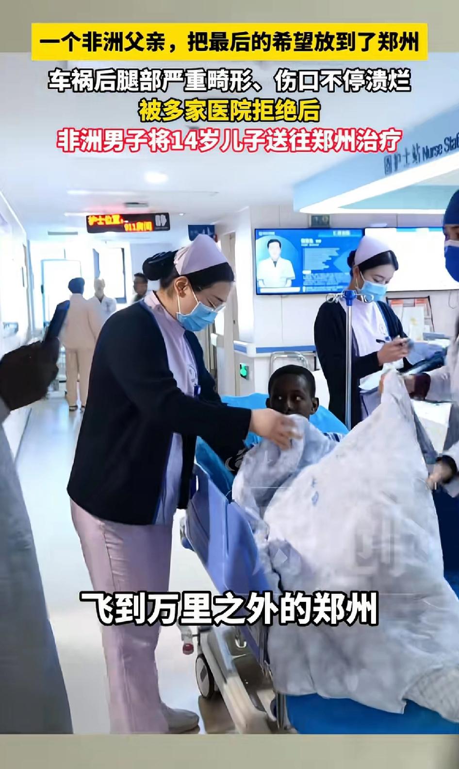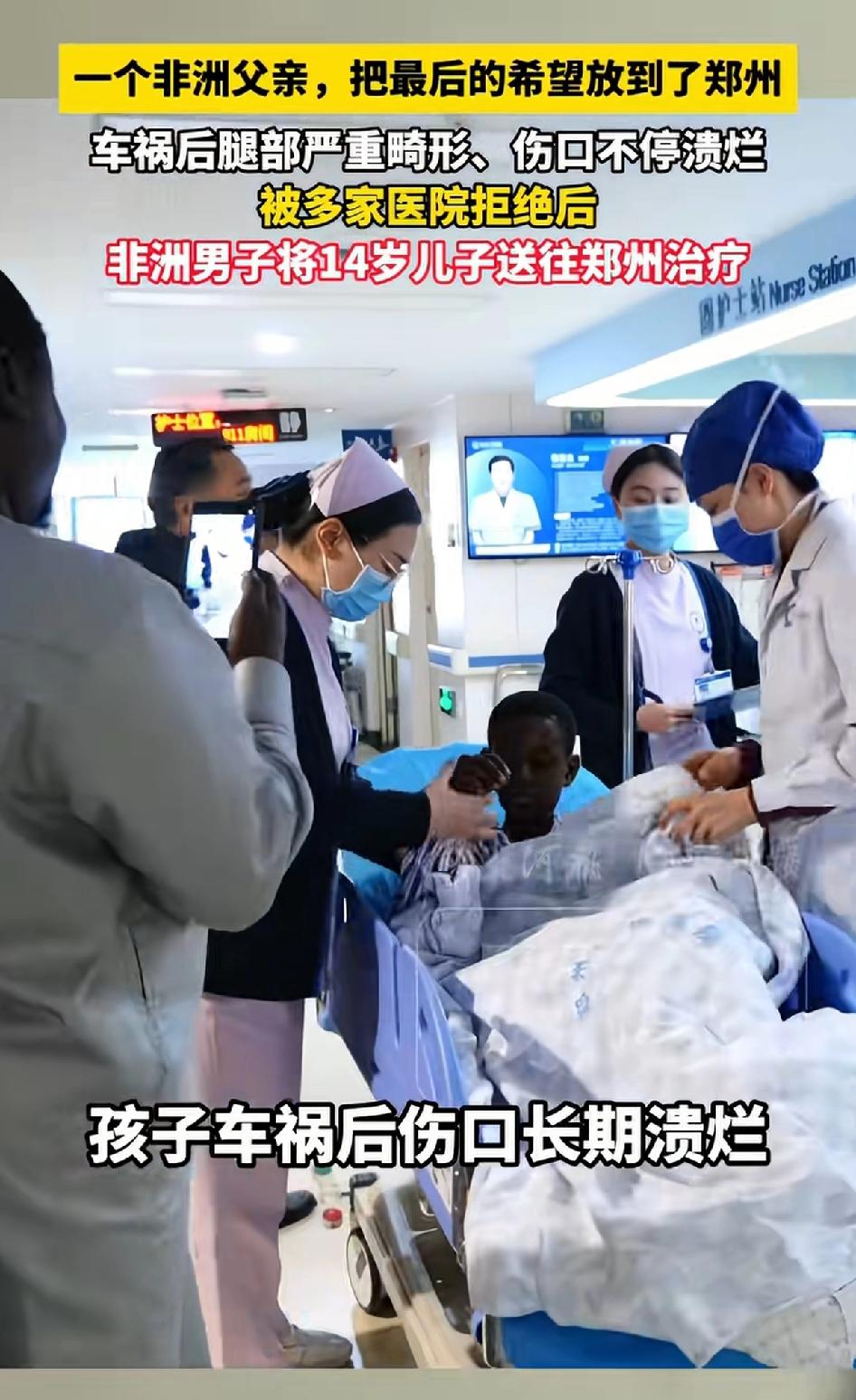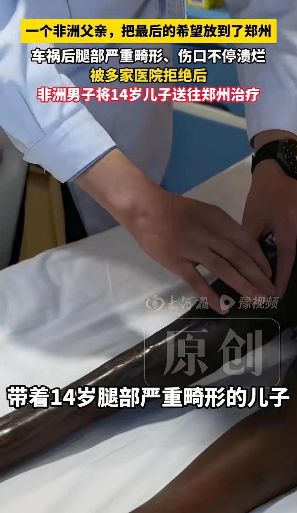 一个非洲父亲把最后的希望放在了郑州,非洲男子将14儿子送往郑州治疗,因自己儿子车祸后腿部严重畸形、伤口不停溃烂。被多家医院拒绝。 一个非洲父亲的艰难寻医路,让人动容。四年前,14岁的非洲少年玛玛鲁遭遇车祸,右下肢严重畸形,伤口不停溃烂。在非洲,他的父亲向无数医院求助,都因技术有限被拒绝。 偶然间,父亲听说郑州仁济医院擅长治疗复杂肢体畸形和创面修复,便抱着最后一丝希望发出申请,得到了“来吧,我们愿意帮助你”的回应。 3月26日,在康复大厅里,玛玛鲁在护士引导下尝试踩地,病友还塞给他糖果,他露出腼腆笑容。为了正常走路,他等了四年,希望他能在郑州迎来新生,重新奔跑、跳舞。
