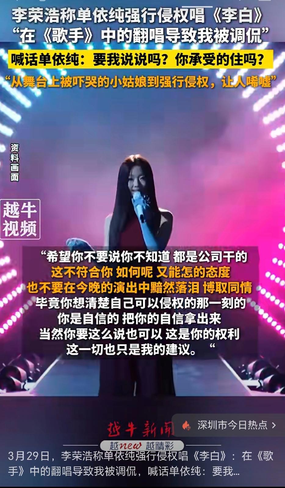 李荣浩称单依纯强行侵权唱《李白》在《歌手》中翻唱导致我被调侃,并喊话单依纯:要我说说嘛?你承受的住吗? 李荣浩说单依纯在《歌手》翻唱《李白》是强行侵权,这事儿还挺有看头。《李白》可是李荣浩的代表作,旋律和歌词都很有特色,很多人都爱唱。 单依纯在节目里翻唱,肯定会被大家拿来和原版比较。李荣浩说被调侃,估计是大家老拿翻唱和他原版对比,让他有点无奈。 其实翻唱经典歌曲很常见,歌手也想展现自己的风格。不过这事儿也提醒了大家,翻唱虽然是致敬,但也得考虑原唱的感受,不然就容易像这次一样,让原唱心里有点膈应。