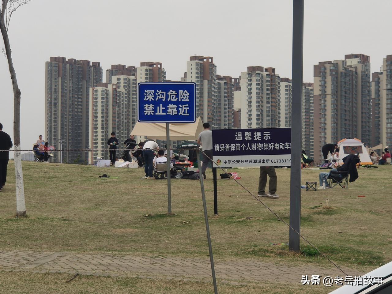 看看都有谁家的孩子?可得当心,这里不但沟深而且下面就是虹吸暗河,一旦跌落十分凶险。刚刚途经陇海路丹水大道附近时看到,由于天气晴好,再加上是双休日,这里的环境又十分有诱惑力,前来这里路两边草地廊道上踏青的人确实不少,赶上赶庙会了!踏青本是一件快乐的事儿,但一定要注意危险,现场看到一些小孩儿不顾危险,无视草坪上有关单位竖立的写有:“深沟危险,禁止靠近”的提示牌,下到深沟河边玩耍,而离他们不远的地方就是下穿南水北调地下的暗河。一旦跌落,后果严重。