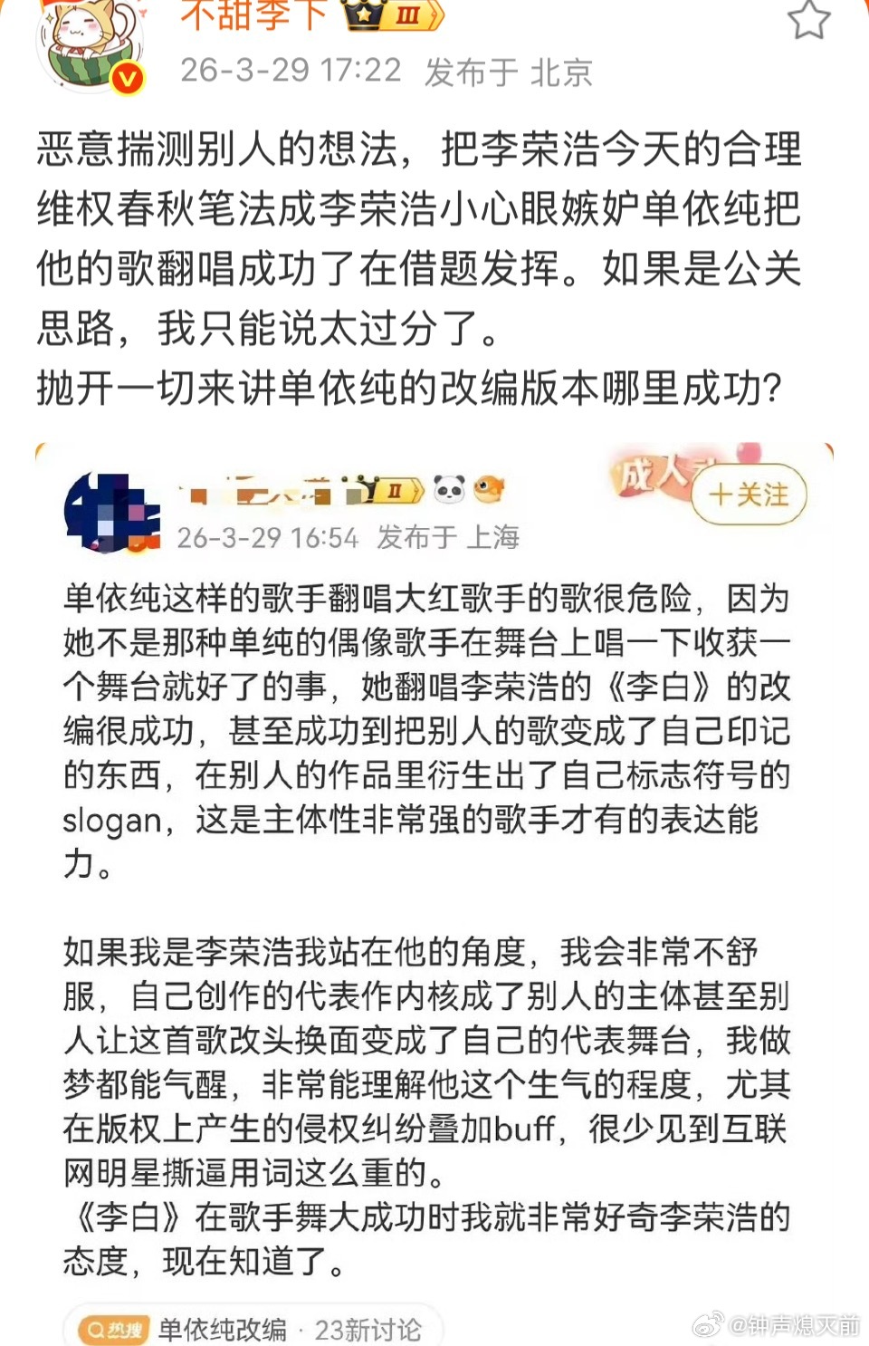 李荣浩发文控诉单依纯,翻唱没获得许可啊!终于可以说了,她毁了李白,完全是毁人家作