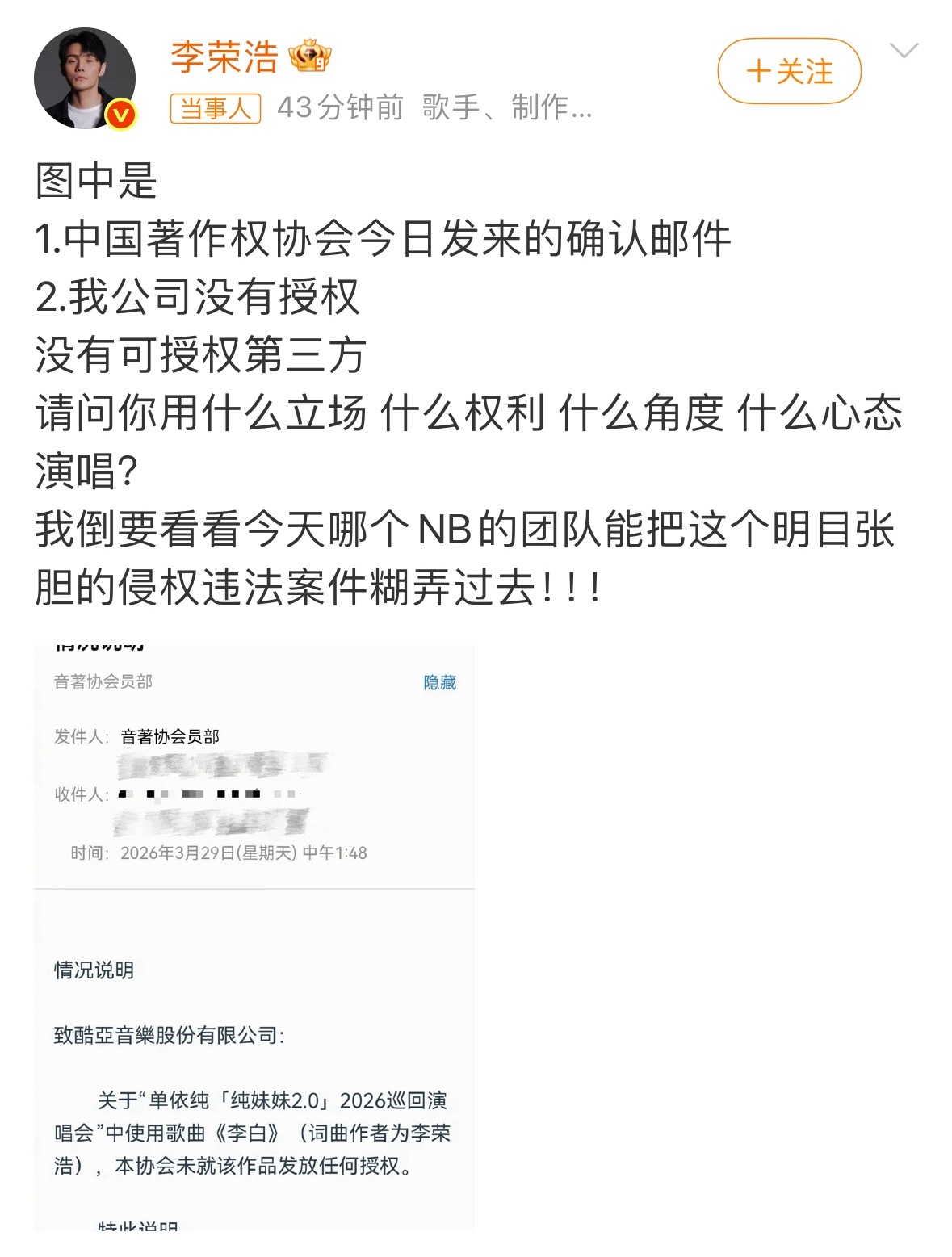 wok,李荣浩好刚发中国著作权协会确认邮件再次质问单依纯并放狠话:我倒要看看今天哪个NB的团队能把这个明目张胆的侵权违法案件糊弄过去❗️