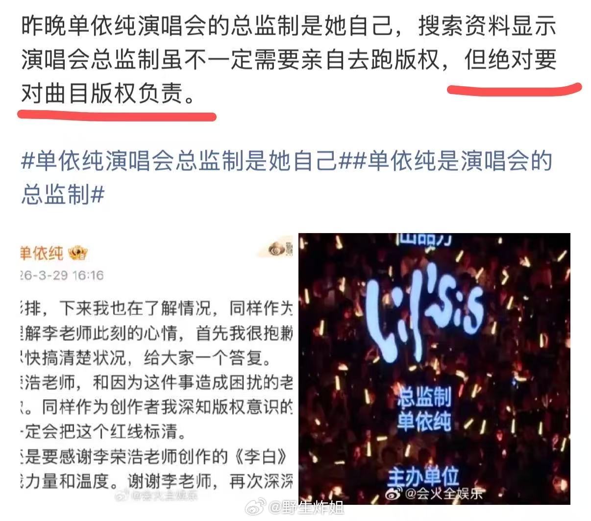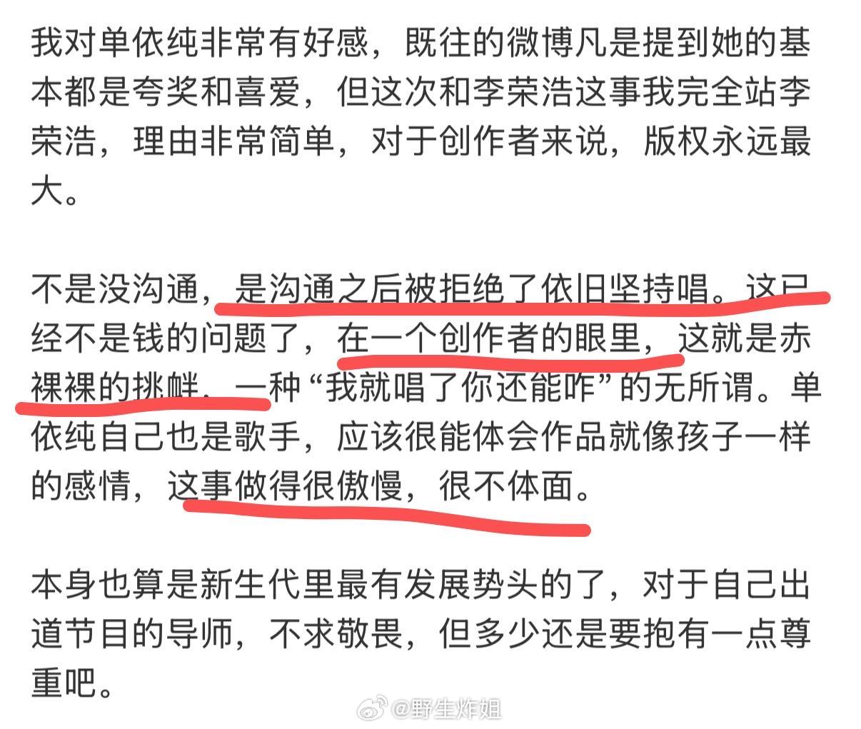 网友劝单依纯从艺先从德 单依纯这个回应还是一如既往地不会说话啊作为演唱会总监制她明知侵权在先,怎么就反过来理解李荣浩的心情了呢,人居然可以傲慢到这种程度吗……单依纯侵权了但理解李荣浩的心情