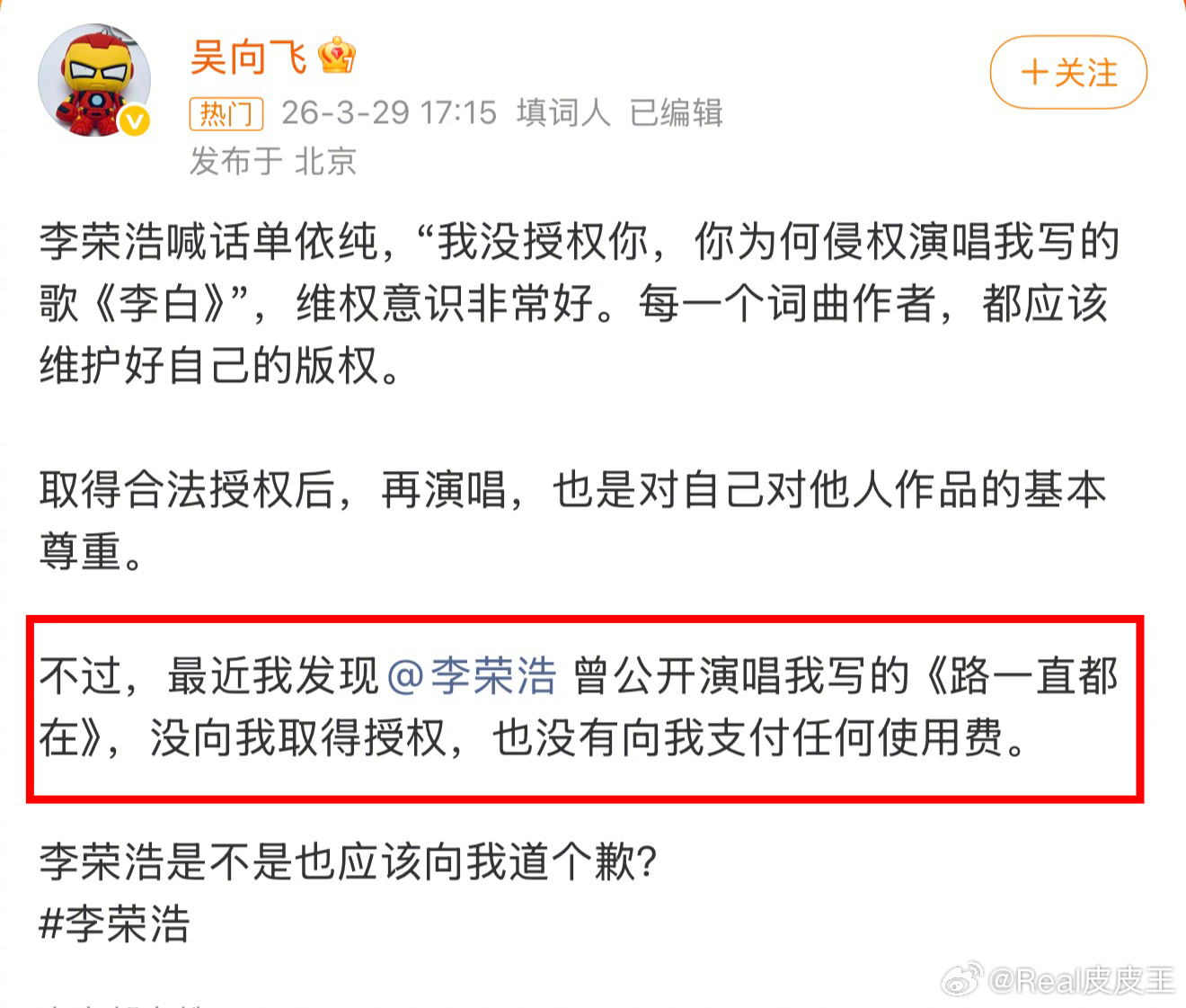 啊?开始精彩起来了?吴向飞喊话李荣浩道歉:公开演唱我写的《路一直都在》,没向我取得授权,也没支付任何费用。