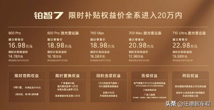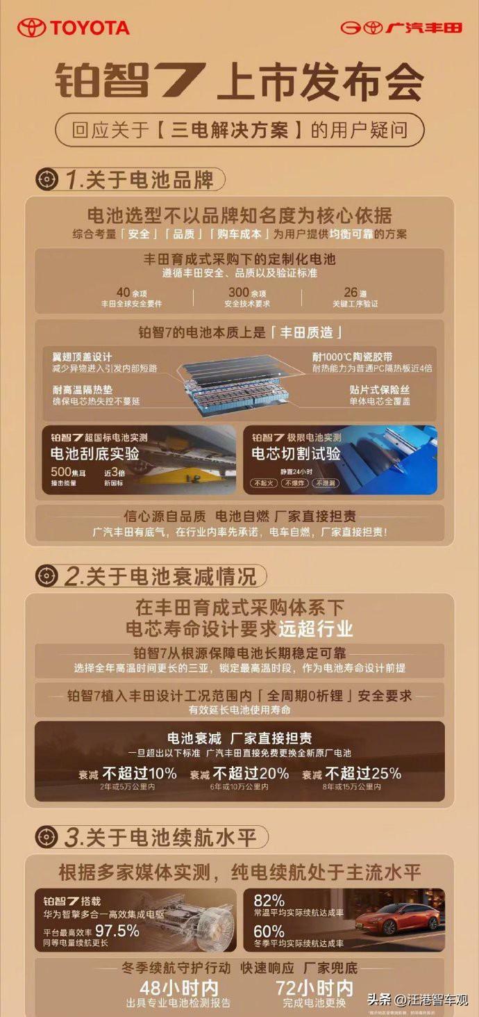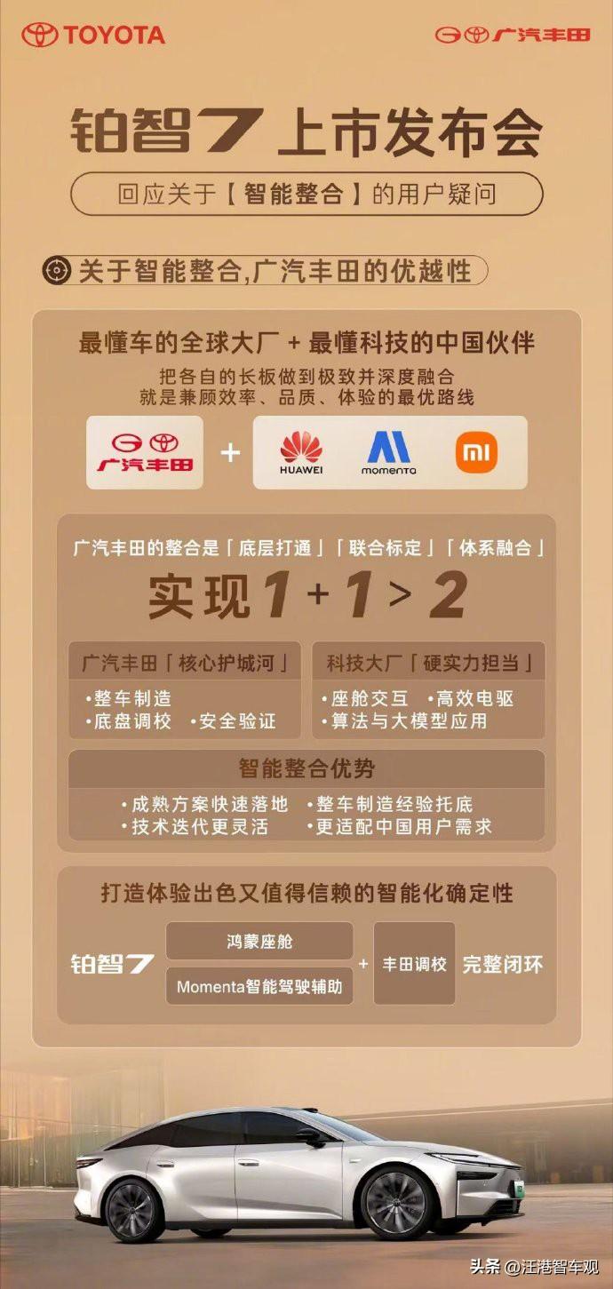 几个月前,很多人都说“合资车做不好新能源汽车”;这几个月,这种声音似乎减弱了不少,因为合资厂商做的新能源汽车越来越“上道”了。 3月29日,广汽丰田铂智7正式上市。 说实话,这款车不太“丰田”,或者说,不是人们熟悉的丰田。 首先,价格确实有点狠,官方指导价16.98-22.98万元,但限时补贴权益价只要14.78-19.98万元。全系直接打进20万以内,丰田这是终于看懂中国市场了? 其次,它自身的性能也的确能打。座舱方面,铂智7是丰田首款搭载华为鸿蒙5.0智能座舱的量产车,15.6英寸2K大屏+华为生态,流畅度方面也是第一梯队;辅助驾驶方面,激光雷达版搭载Momenta R6大模型,高速+城区领航辅助都支持,而且终身免费,比很多主流国产车型都更激进。 有这两点,合资车做不好智能的刻板印象被打破了。再说舒适方面,车长超5.1米、轴距超3米,空间妥妥的D级水平。高配有双电机零重力座椅、23扬声器雅马哈音响。 而且,花5000块就能选装双腔空气悬架+智能预瞄,这在20万以内可以说是独一份。续航方面,CLTC工况下最高710公里,3C快充10分钟补能300公里。有意思的是,铂智7还搭载了华为DriveONE电驱,效率达到了97.5%。 从配置上来看,铂智7的“含华量”,比很多国产车都高,看来它已经摸清了中国消费者的喜好。说点实在的:这车不是完美的,但看得出丰田在认真补课,而且补得还不错。 鸿蒙+Momenta+华为电驱,把本土供应链优势用足了,加上丰田自家的品控和售后,它的确具备了很强的竞争力。其实这是好事儿啊:你喜欢丰田,又喜欢新能源,但以前丰田的新能源的确拿不出手。 现在,又可以在国产和丰田之间自由选择了。广丰高管回应铂智7四大关切 铂智7上市限时补贴权益价14.78万起