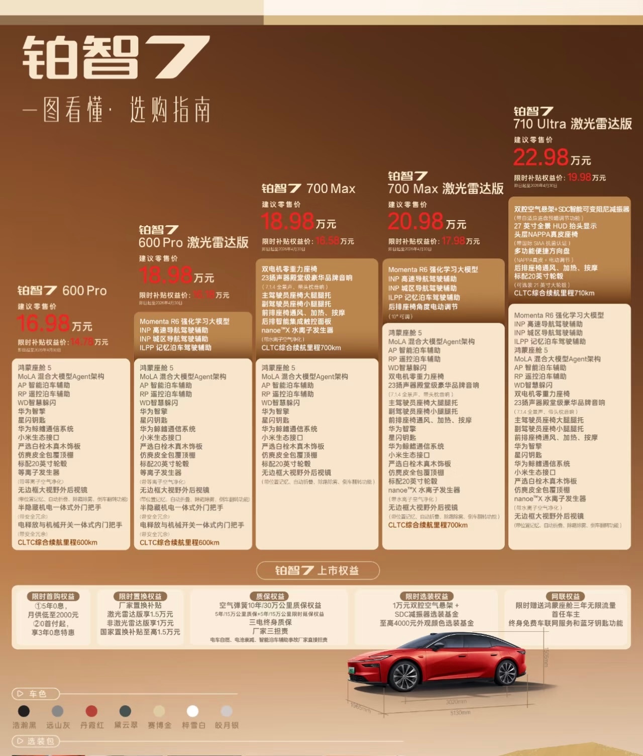 分600、700、710三个cltc续航版本,600和700核心差异在在智驾,710版本顶配包括空簧、HUD、按摩全给了。