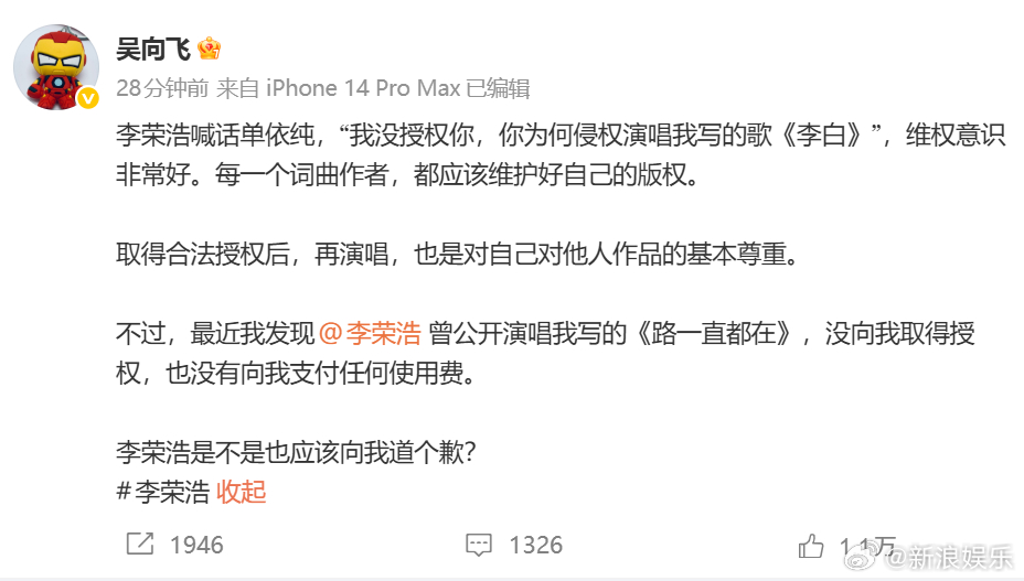 【吴向飞称李荣浩曾唱其写的歌没给钱】 29日,歌手喊话李荣浩,称他发现李荣浩曾