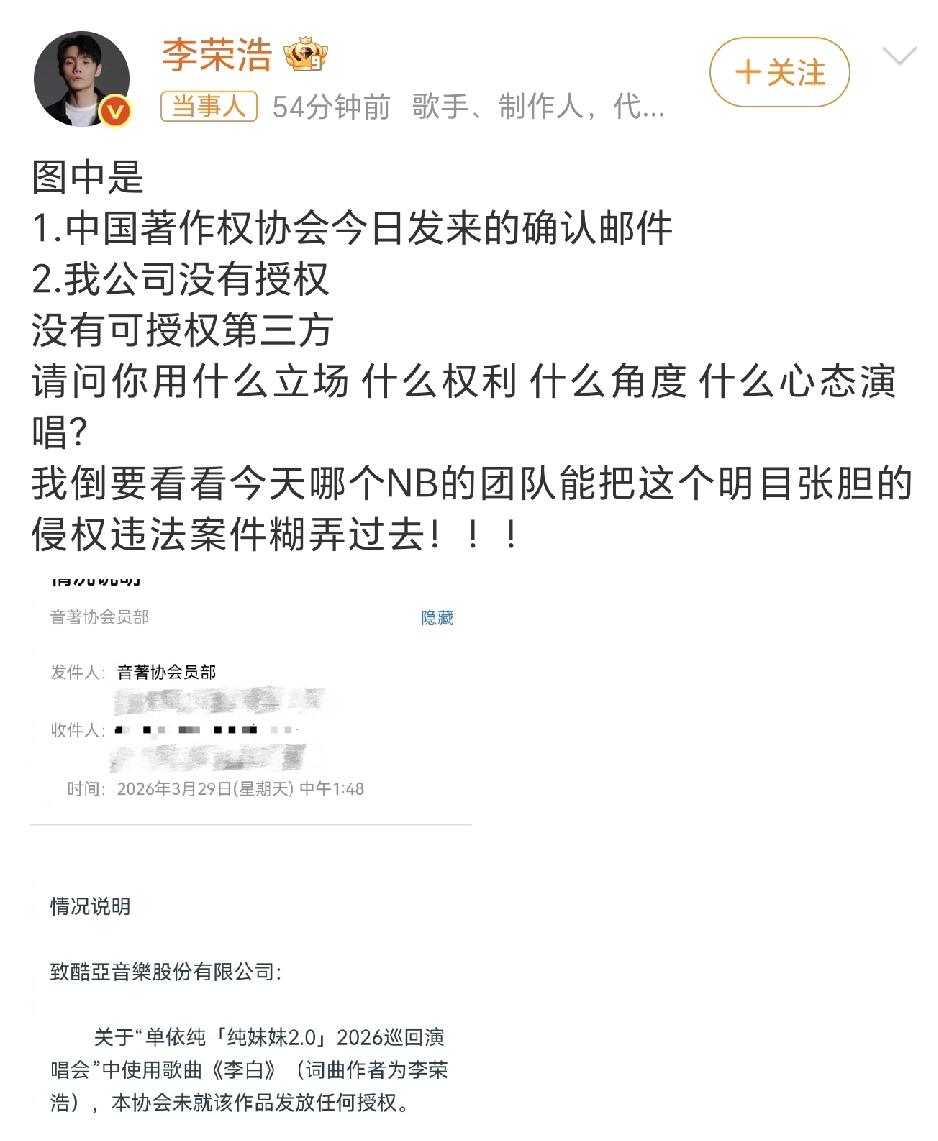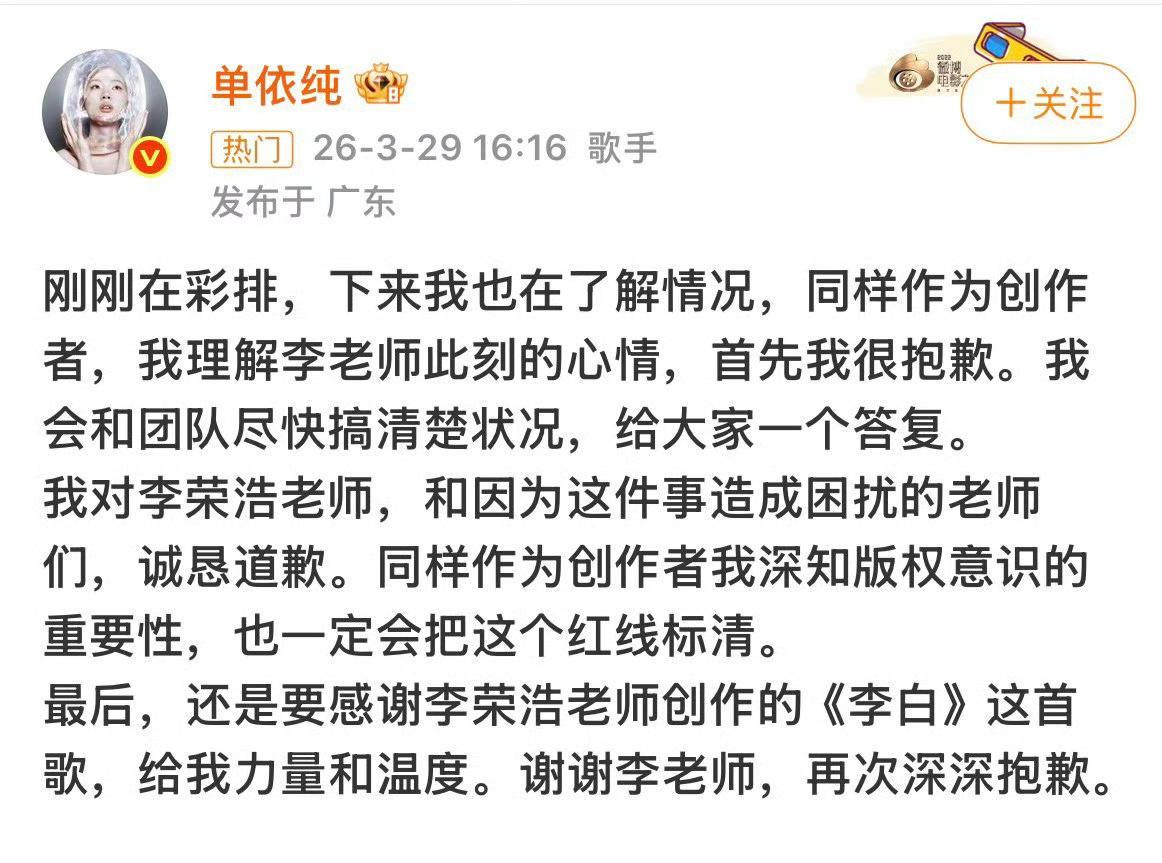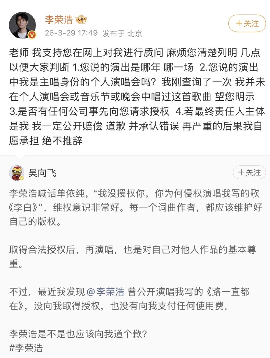 李荣浩质问单依纯侵权还没有结果,又来了吴向飞追责李荣浩,突然间好热闹,热搜一直挂着! 李荣浩是真刚,很少见他发长文,今天不仅接连发问单依纯,又认真的回复了吴向飞,较上真了! 李荣浩的态度很坚决,对单依纯侵权不姑息,不原谅,对吴向飞提出的版权疑问不逃避,调查到底! 单依纯侵权的事铁板钉钉,这个吴向飞是咋回事就不好说了,倒是起到了很好的转移视线的作用[大笑]!李荣浩