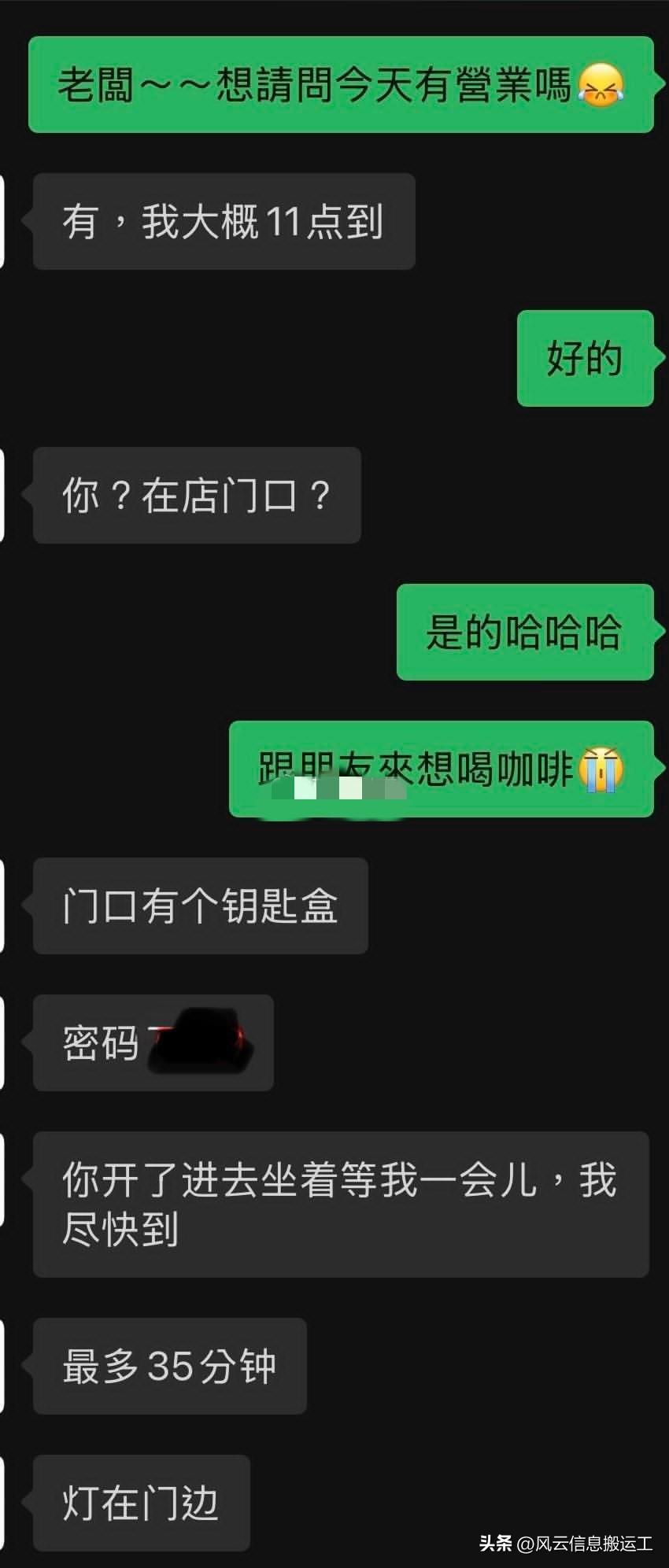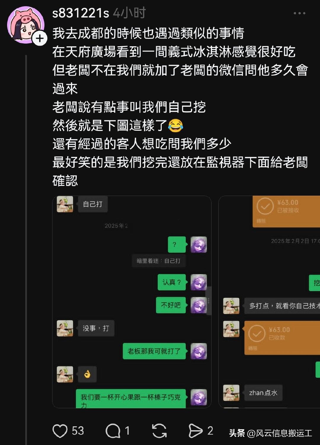 有一个台湾小姐姐分享了在重庆旅游的有趣经历。 她去一家咖啡店,因为去的比较早,老板还没来,就加了老板的微信,老板说还有大半个小时才到。 后来老板就把店里的密码告诉了小姐姐,让她可以到店里面去先坐一会外面比较冷,边上还有书。后来老板还告诉小姐姐怎么制作咖啡的整个流程。让小姐姐得到了一次不一样的旅游体验,让她很是开心。 其他台湾网友看到了,也分享了她在成都的经历,就是老板不在冰淇淋店,他自己在冰淇淋店取冰淇淋的过程。
