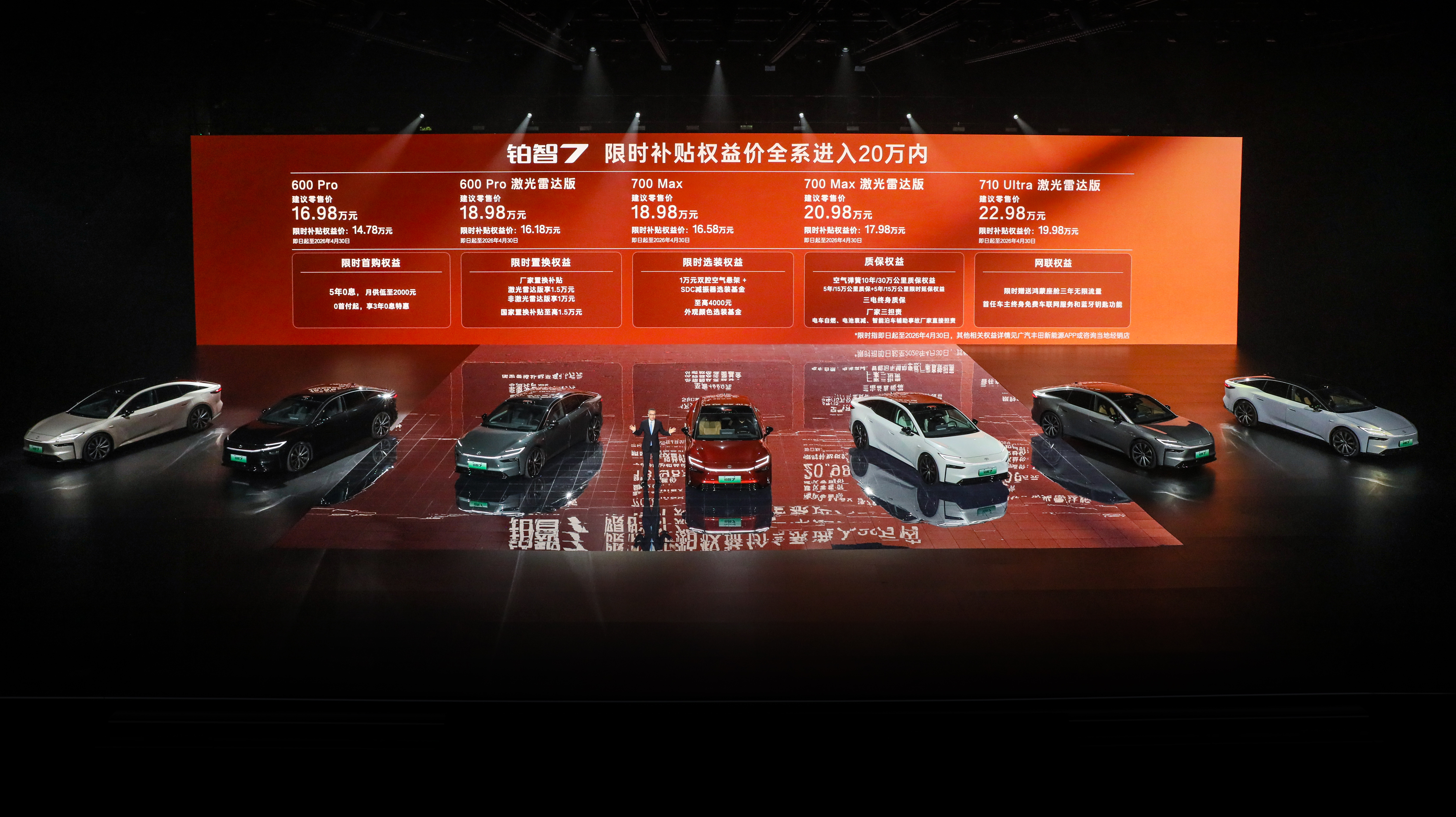 广汽丰田这次的定价策略非常清晰,就是要做那个最强势的搅局者。限时补贴权益价14.78万的门槛,直接把一台大型纯电旗舰交到你手上。而且他们非常懂现在大家买车最看重什么——高频刚需配置绝不含糊。限时补贴权益价17.08万即可拥有双腔空悬纯电家轿第一车。限时补贴权益价18.48万,你能一次性买齐“双腔空悬+鸿蒙座舱5+全场景智驾”。双腔空悬这种过去高高在上的东西,被铂智7一把拉进了17万级的平民市场,这配置真的是太给力了。