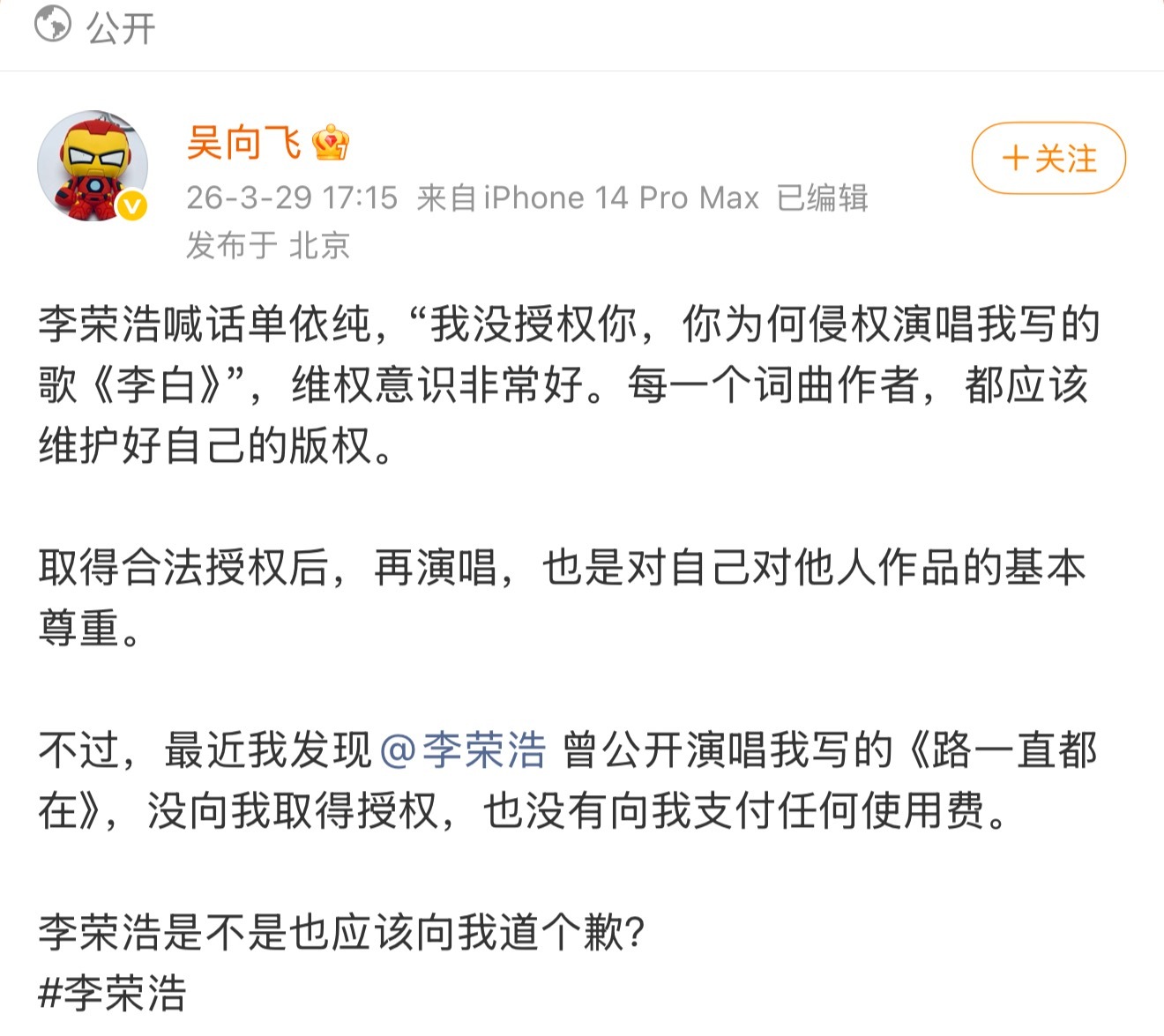 李荣浩转发回复吴向飞 李荣浩 望您明示 李荣浩直接转发回复了吴向飞的喊话:1.询问吴向飞所说演出是哪年哪场。2.询问演出中自己是什么身份。“我刚查询了一次 我并未在个人演唱会或音乐节或晚会中唱过这首歌曲 望您明示”3.有没有公司事前请求授权4.表示如果是他的责任,承担后果绝不推辞。