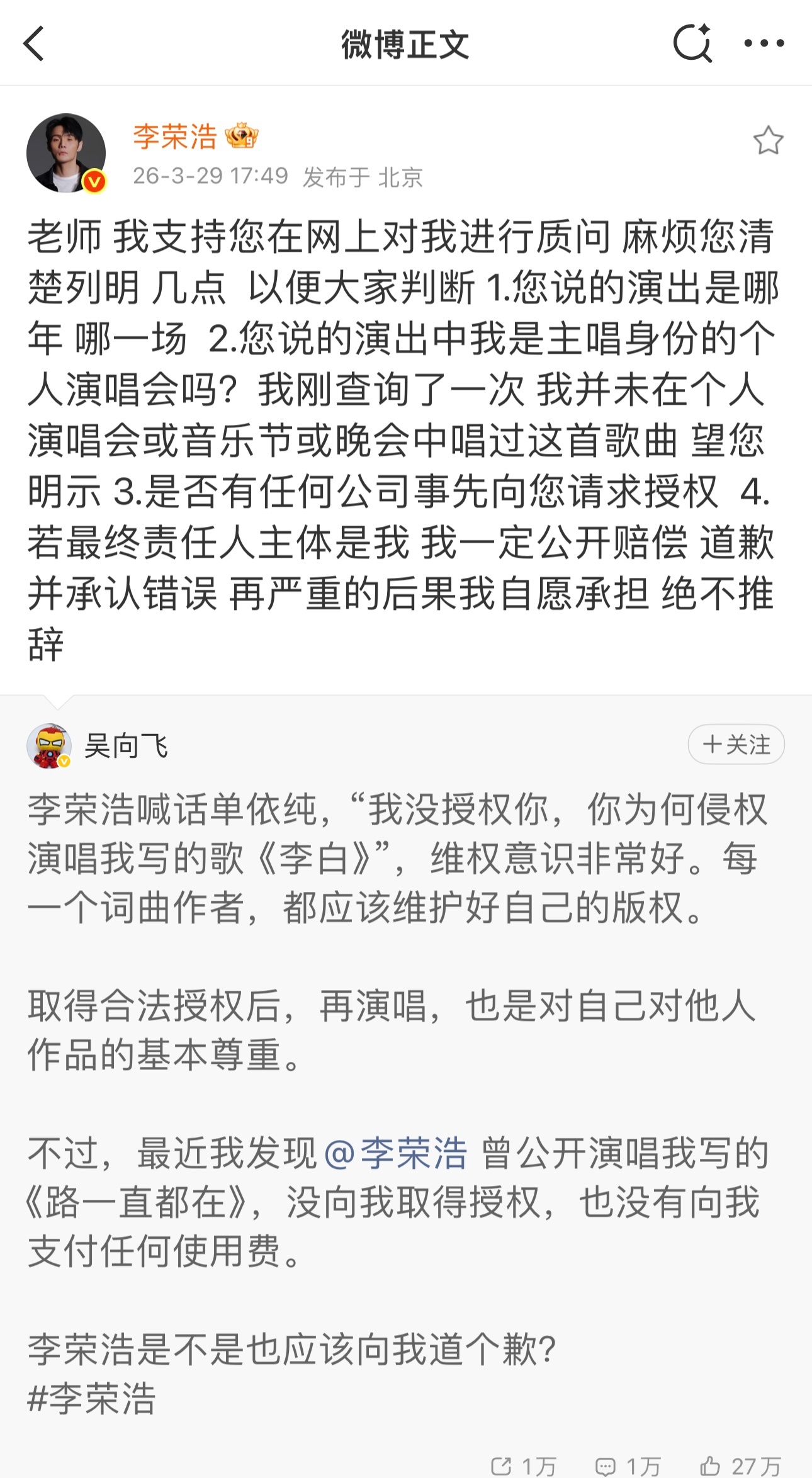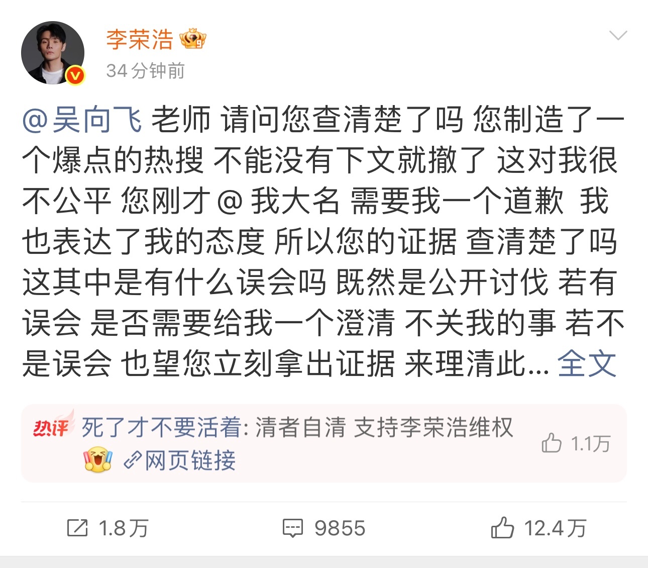 李荣浩让吴向飞拿出证据太刚了哥!不仅转发列清楚了,而且再次发博让吴向飞拿出证据,自己和律师都在等他,维权模板🈶