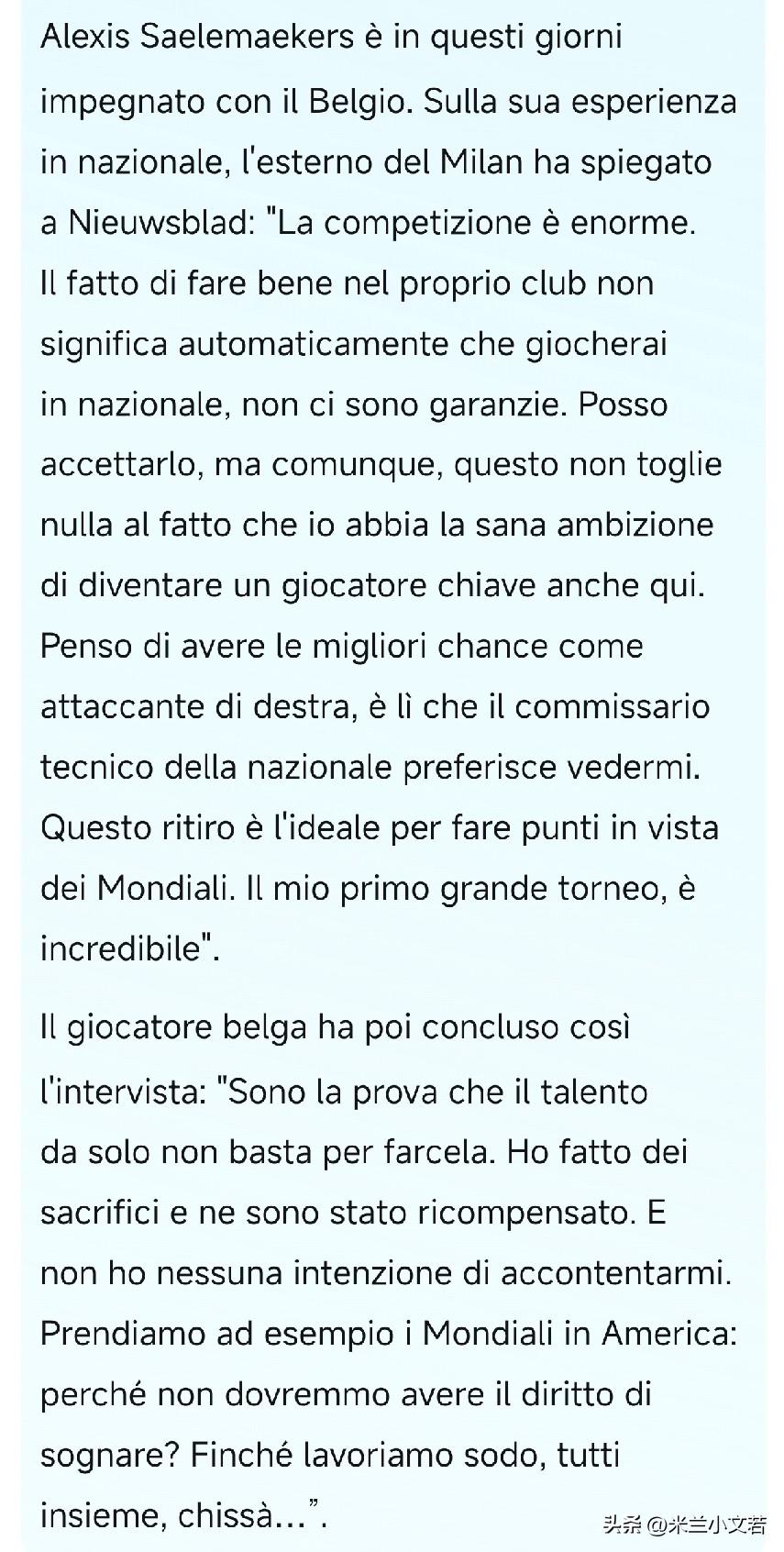 萨勒马克尔斯对位普利西奇。萨勒马克尔斯接受采访表示我很熟悉普利西奇,但那只是作为队友,作为对手普利西奇是令人恐惧的,,你根本不清楚如何去防守他。个人觉得主要原因是萨勒马克尔斯祖传手艺挑衅不能使用,所以防守普利西奇吃力。 萨勒马克尔斯接受采访表示自己希望成为比利时国家队重要的球员。国家队的竞争非常激烈,并不是说你在俱乐部表现好,就自动能在国家队获得出场机会,这里没有保证。我能处理好这种情况,但我仍然有健康的野心,希望在这里也成为一名关键球员。同时萨勒马克尔斯认为比利时国家队主教练更懂自己,因为他的位置是右边锋,他可以更接近球门,可以给对手制造更多的麻烦。 个人观点萨勒马克尔斯回到米兰又要低迷一段时间了,萨勒马克尔斯甘心做绿叶的时候他就是最好的萨勒马克尔斯,还能偶尔变身梅西,当萨勒马克尔斯想成为主角的时候他就是米兰的麻烦。本赛季开始阶段萨勒马克尔斯表现十分出色,但当俱乐部、球迷和媒体开始赞美萨勒马克尔斯的时候他的心态就变了,很多不合理的拿球与突破就出现了,我一直都觉得他是一个很好的角色球员,在攻防两端兢兢业业贡献自己的力量,角色球员就是角色球员,想从角色球员变成决角儿,就会出问题。