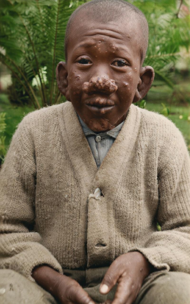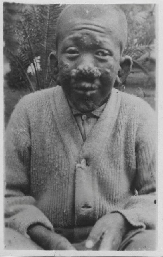 江门麻风病院,一位麻风病男孩正坐在户外,直面镜头的模样。 他的面部被麻风病彻底改变,额头布满深刻的褶皱,鼻部与脸颊爬满结节与瘢痕,五官在病灶的侵蚀下扭曲变形,曾经稚嫩的面容被病痛啃噬得面目全非。但他的眼神却意外地平静,没有哭喊,没有怨怼,只有一种过早成熟的麻木与坚韧。 他穿着一件厚实的针织开衫,里面衬着干净的衬衫领,衣物的整洁与温暖,他的双手安静地放在膝上,指尖的形态隐约可见,那是麻风病尚未完全侵蚀的部分,却也预示着未来可能的残缺。