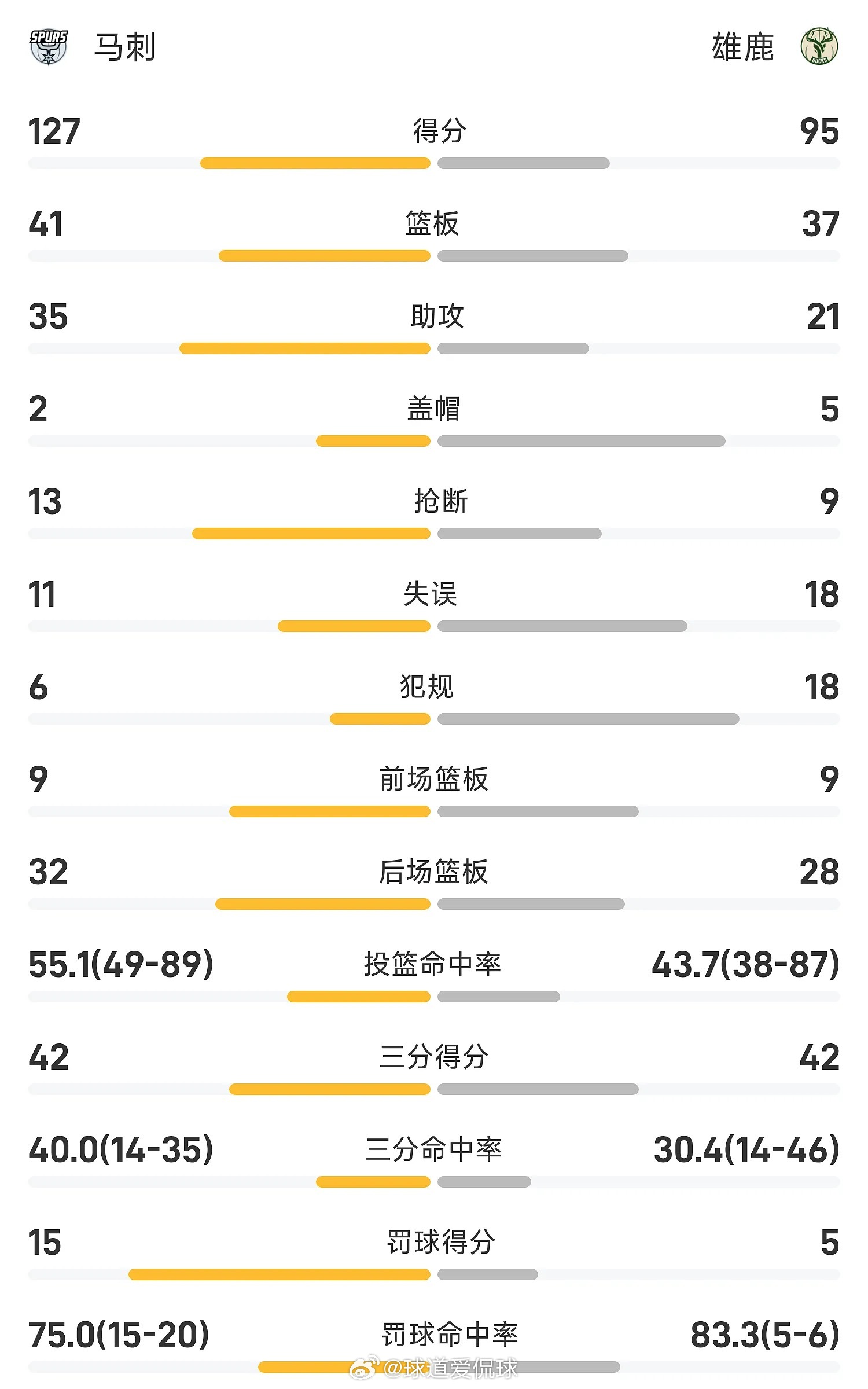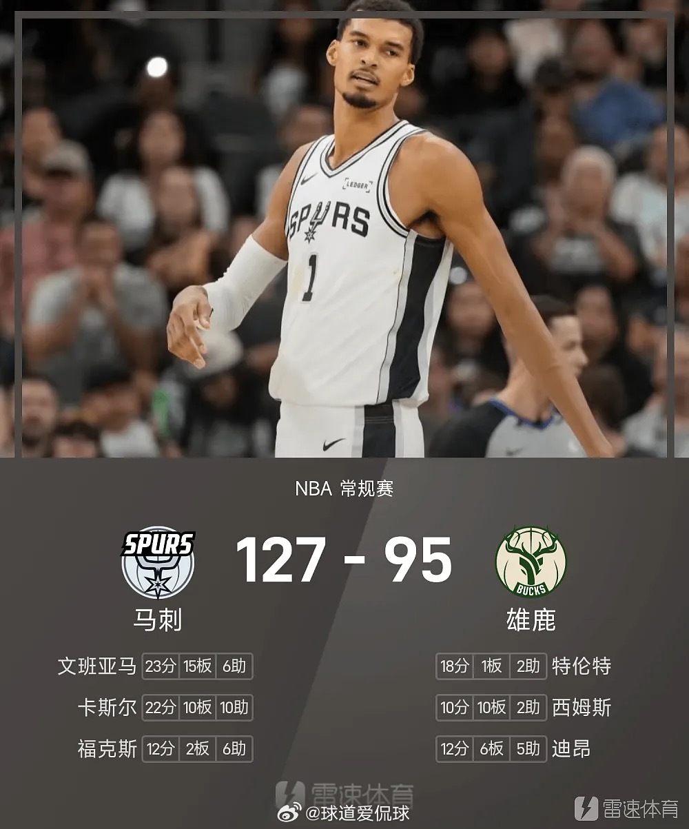 03月29日讯 25/26赛季NBA 常规赛,雄鹿对阵马刺。双方全场战罢,雄鹿95-127不敌马刺。文班亚马砍下全场最高的23分15板6助,率领马刺成功取胜。体育明星NBANBANBA常规赛