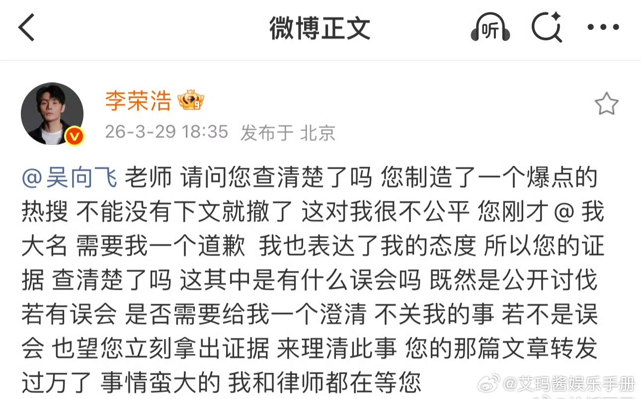 李荣浩直接艾特吴向飞喊话查清楚了没有,不要没下文就撤了,好刚啊吴向飞喊话李荣浩道