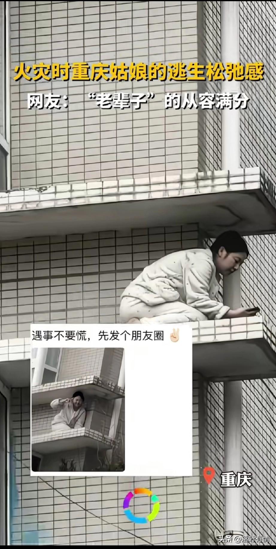 重庆一小区发生火灾, 一姑娘直接从窗户下去, 躲在了两个楼之间的楼夹板, 这里平时就是放空调的地方, 这回成了避难空间, 不知道的还以为她在玩躲猫猫, 实际是人家是在躲火灾, 楼下的群众都看傻眼了, 很快,消防官兵就将她救了出来, 离开之前她还发了朋友圈, 这松弛感是和老一辈学的吗? 现在的女生都这么勇敢吗? 这或许就是最正确的自救方式, 毕竟只要你下到了下一层, 就可以逃出生天, 毕竟火和烟都是往上走的, 不过这种逃生方式不太建议, 毕竟太过危险了, 是所有人都能做到像姑娘一样这么勇敢,大家觉得重庆这位姑娘是不是很厉害? 重庆 高层住宅楼火灾 火灾事故实拍 高层楼道着火 老旧楼火灾