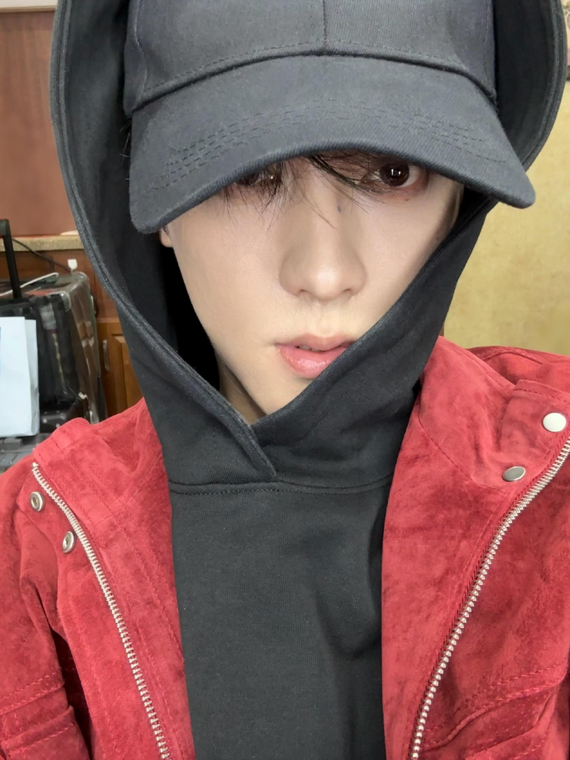 田栩宁|一组日常自拍营业,红色麂皮外套搭配黑色连帽卫衣,今天是青春男大