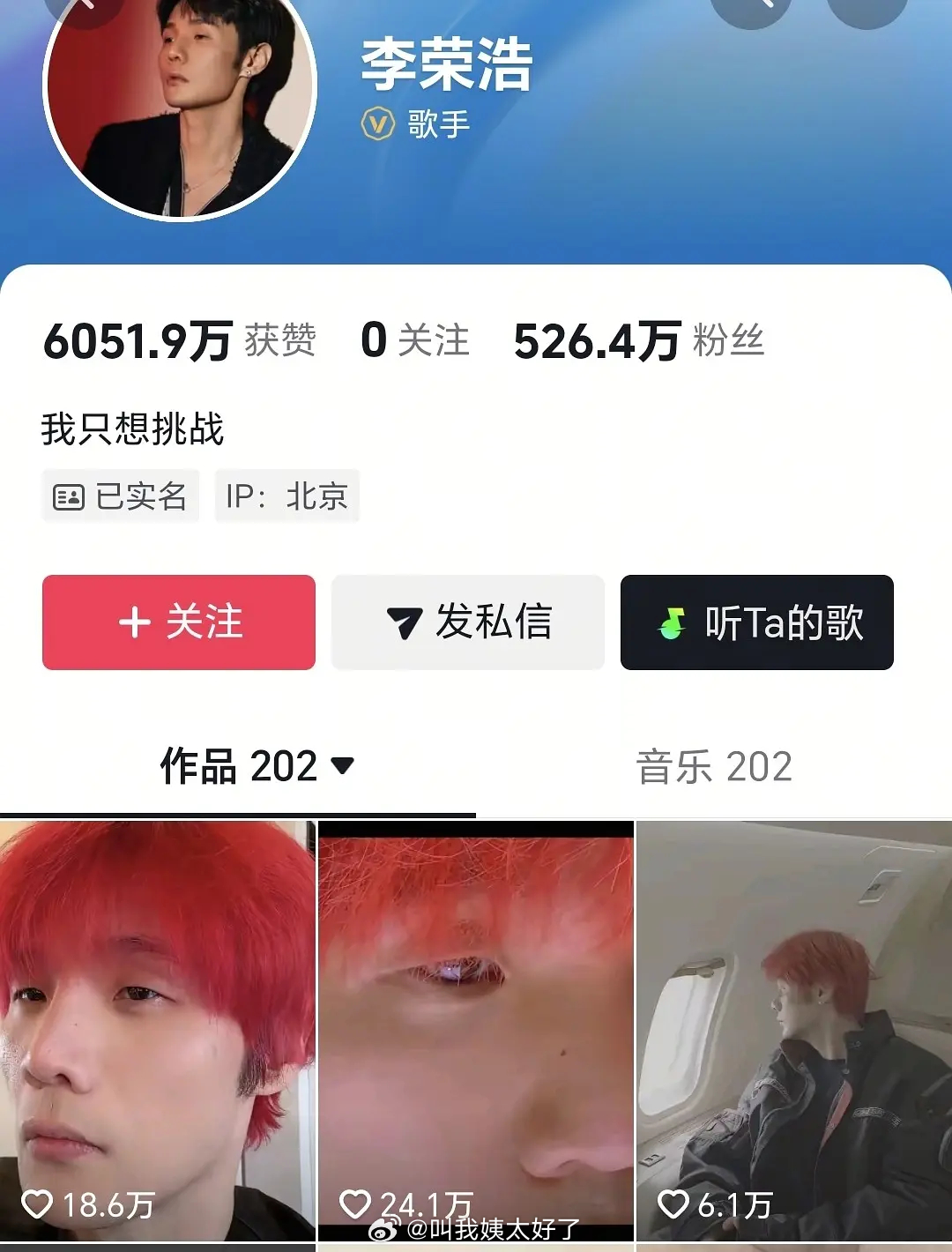 如果有人觉得李荣浩是软柿子的话,请看李荣浩的个性签名:我只想挑战。