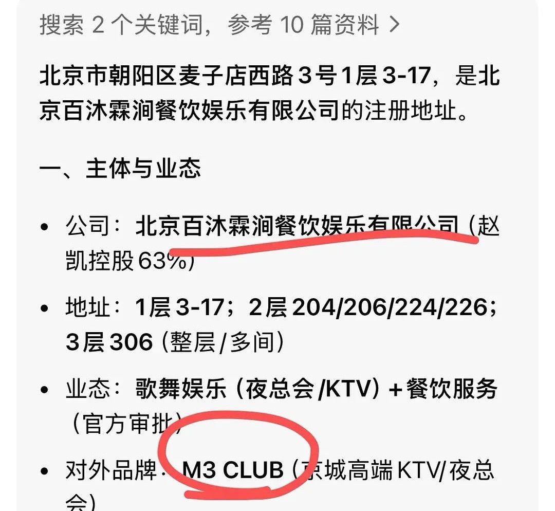 这人身份不简单,名为赵凯,经营着北京百沐霖涧餐饮娱乐有限公司,这个公司旗下有个店叫“M3 CLUB”,也是前几天郭麒麟、刘昊然、严浩翔惹争议的那个商K,没想到这两个瓜也能联动!