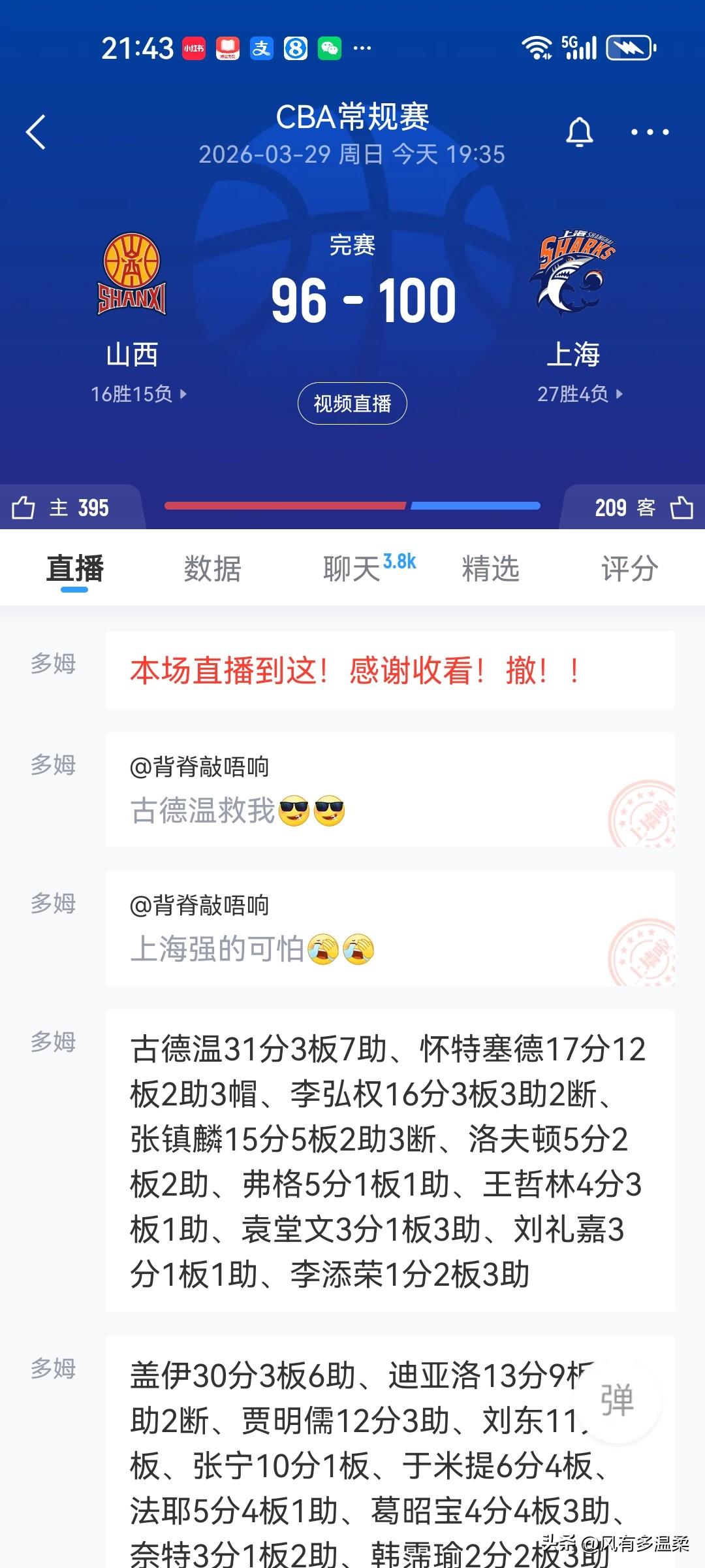 半场领先,最后失利,比分96-100,两场比赛的版本竟如出一辙 CBA篮球联赛第31轮和32轮的两场比赛,从比赛过程到比赛结果,竟如此相似,连最后的比分都是96一100,同样主场作战的两队都输了。 山西汾酒队主场迎战己12连胜、排名第一、已经锁定CBA季后赛门票的上海男篮。两队的差距地球人都知道,山西汾酒队在以前同上海队的比赛全部失利。但总觉得山西队应拿出点什么来,阻击下上海队。比赛还真是如想象般进行,在第一节落后上海3分,从第二节开始,山西队发挥的相当出色,战术很成功。小外援盖伊屡中三分,山西汾酒实现反超并领先结束上半场。第三节双方打得难解难分,分差不大,但上海迫近了比分。第四节,双方打出了CBA篮球联赛中少见的好比赛,你进一球我进一球,你有三分我必回应三分,好像在看NBA。在上海队领先到7分时,都认为山西大势已去,可盖伊神奇的三加一又把比赛拉回悬念。只是盖伊突篮下不中,山西才彻底失去了胜利的可能。第四节盖伊上场太晚了,若提前几分钟上场,比赛的结果还不一定呢。 上海方面,古德温超常发挥,第一节里突外投得分就上双了。看来他要弑旧主,最后几秒时,就是他罚球,使比分定格在96一100,弑旧主成功,也成就了上海的13连胜。 山西虽未能阻止上海连胜,但本场比赛山西的发挥不失为强队表现,虽败犹荣!cba新排名 CBA逆转时刻 晋篮砥砺前行