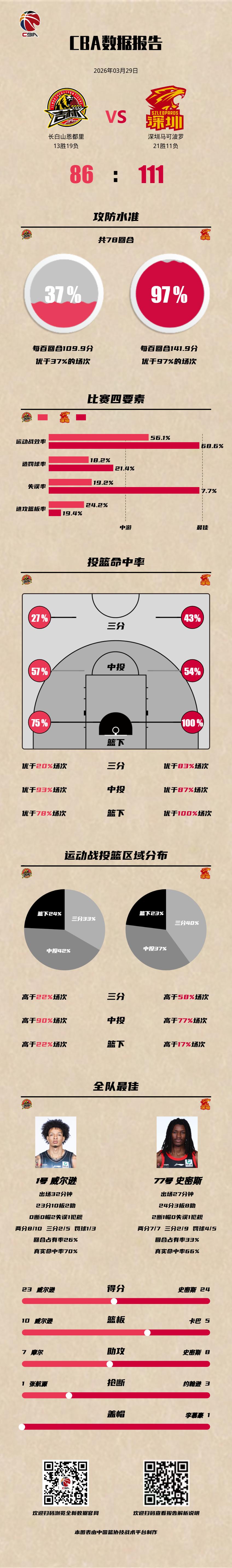 长白山恩都里 86-111 深圳马可波罗 吉林男篮vs深圳男篮 长白山恩都里:威尔逊23分10篮板,摩尔19分3篮板7助攻,姜伟泽15分; 深圳马可波罗:史密斯24分3篮板8助攻2抢断,王浩然23分5篮板4助攻,贺希宁22分4篮板5助攻。以城之名