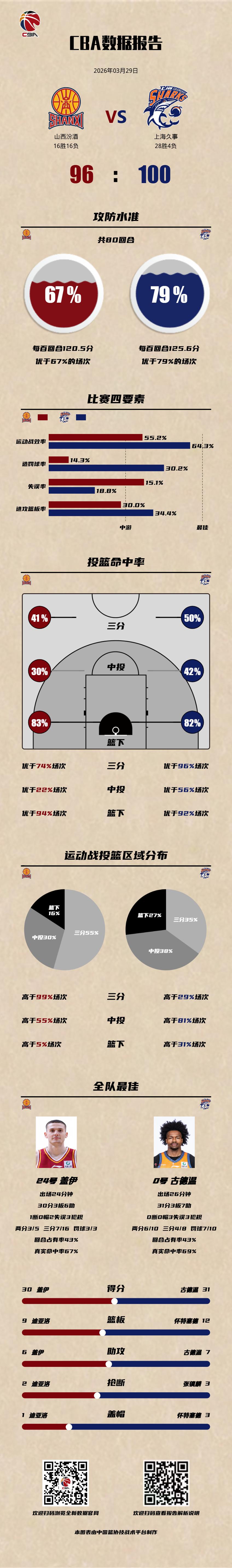 山西汾酒 96-100 上海久事 山西男篮vs上海男篮 山西汾酒:盖伊30分3篮板6助攻,迪亚洛13分9篮板3助攻2抢断,贾明儒12分3助攻; 上海久事:古德温31分3篮板7助攻,怀特塞德17分12篮板3盖帽,李弘权16分3篮板3助攻2抢断。以城之名