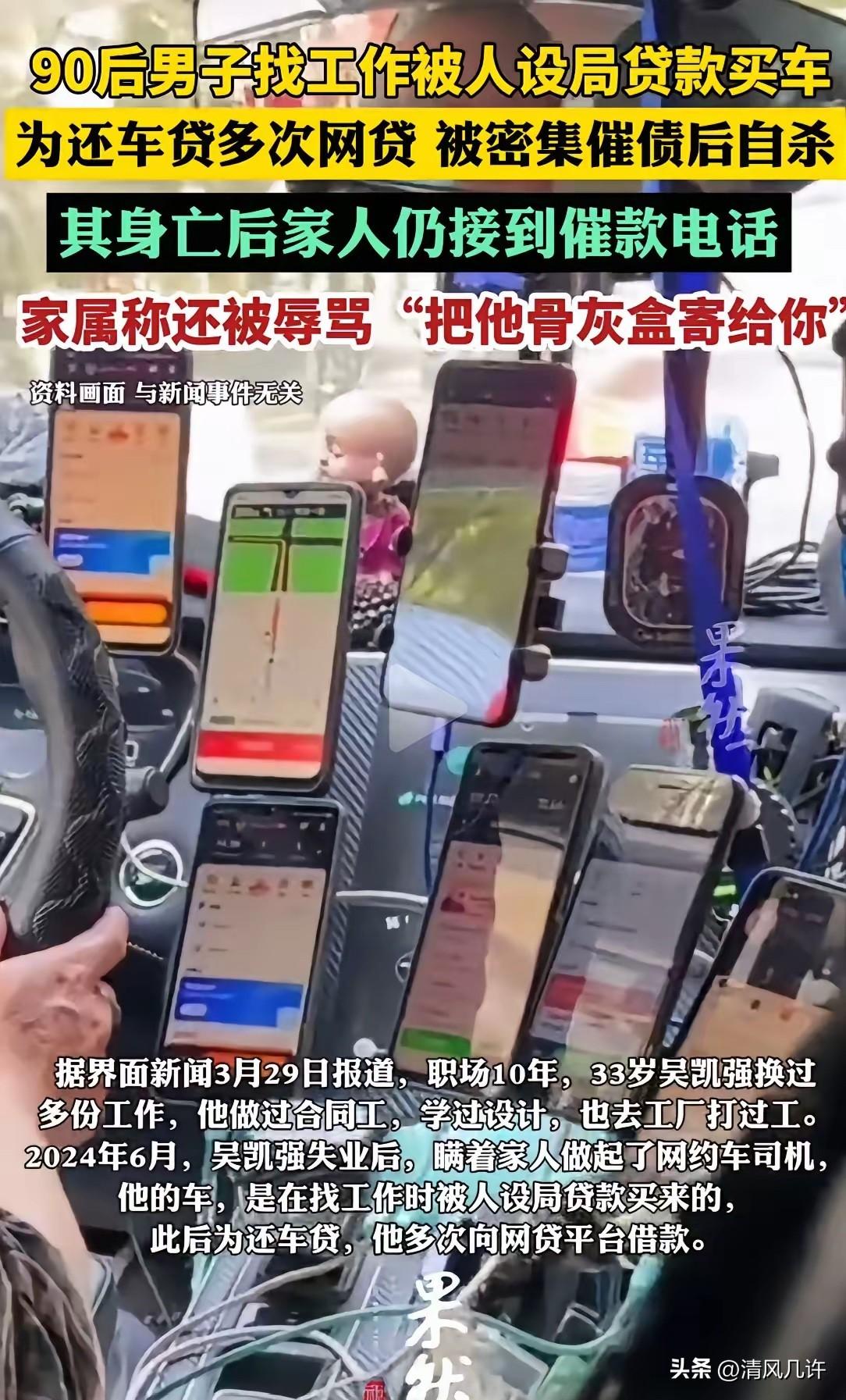 浙江东阳,33岁的男子,在母亲长眠的公墓旁,在车里结束了生命。而悲剧的开始,以为能找到月入过万的司机工作,不料,却掉进了“贷款买车”的陷阱,最终男子被无休止的催债,逼上了绝路。最让人难以接受的是,男子死后,家人还接到催收电话,被辱骂:“把他骨灰盒寄给你”。 这名男子叫吴凯强,33岁的他在职场摸爬滚打了十年,换过数份工作,做过合同工,学过设计,也进过工厂流水线,却始终没攒下多少积蓄。 2024年6月,他再次失业,看着家里年迈的父亲和刚上小学的继女,心里急得发慌,只想找一份能快速挣钱的活计,撑起这个家。 他在招聘平台刷到一则“高薪网约车司机”的广告,对方承诺只要入职就能月入过万,还包派单、包培训,唯一的要求是必须通过指定渠道贷款购买指定车型。他没多想,只觉得这是翻身的机会,瞒着家人签了贷款合同,提了一辆市场价十几万的车,可贷款金额却高达三十多万,利息高得离谱。 入职后他才发现,所谓的高薪不过是画饼,平台派单量少得可怜,根本跑不出足够的流水,连每月近八千的车贷都还不上。为了不逾期,他开始向网贷平台借钱,拆东墙补西墙,一笔笔小额贷款滚成了巨额债务,利息和违约金像滚雪球一样越滚越大。 催债的电话很快就打了过来,从早到晚,不分昼夜。他把手机调成静音,躲在车里跑单,可短信、微信的轰炸从没停过,催收人员不仅威胁要上门找他,还扬言要联系他的家人、朋友,甚至要去他的户籍地村委会广播,让所有人都知道他欠钱不还。 他每天天不亮就出门,跑到深夜才回家,累得倒头就睡,可一闭眼就是催收的辱骂和威胁,连梦里都是家人被骚扰的场景。 2025年10月19日,他终于扛不住了。他给家人发了一封邮件,字里行间全是愧疚和绝望,他说自己每天不停开车,可还是躲不开催收的骚扰,怕连累家人,怕让父亲和继女跟着受委屈,他说自己是废物,对不起所有人,可他真的不想死。邮件发出后,他开车去了母亲长眠的公墓,在车里结束了自己的生命。通话记录显示,他死亡当天,还接到了四通来自催债者的电话。 他走后,催收的骚扰并没有停止,反而变本加厉。家人接到无数电话,有人在电话里辱骂他的父亲,甚至叫嚣“把他骨灰盒寄给你”,还不断骚扰他的继女、前雇主和朋友,把他的债务信息到处散播,让整个家庭陷入巨大的痛苦和耻辱中。 他的父亲拿着他的遗书和催收记录,一次次去派出所报案,可最初的反馈总是“经济纠纷,自行协商”,直到媒体介入,舆论发酵,事情才迎来转机。 2026年2月27日,浙江省东阳市公安局终于对此事刑事立案,调查背后的套路贷团伙和暴力催收行为。律师指出,对方以高薪工作为诱饵,诱导当事人签订高额贷款合同,属于典型的“套路贷”,而死后仍对家属进行辱骂骚扰的行为,已经涉嫌寻衅滋事和侮辱,必须承担相应的法律责任。 这件事像一根刺,扎在每个普通人的心上。吴凯强不是个例,无数年轻人在求职时被类似的陷阱套牢,从“培训贷”到“买车贷”,从“高薪岗位”到“零门槛创业”,套路层出不穷,而背后的暴力催收,更是把无数家庭推向深渊。我们总说要努力生活,可当陷阱就在脚下,当催收的魔爪伸向无辜的家人,普通人的挣扎显得如此无力。 他用生命换来的,不仅是家人的痛苦,更是对职场陷阱和暴力催收的控诉。我们期待法律能严惩这些作恶者,也希望更多人能看清这些披着“高薪”外衣的骗局,别让下一个吴凯强,再用生命为这些罪恶买单。 各位读者你们怎么看?欢迎在评论区讨论。
