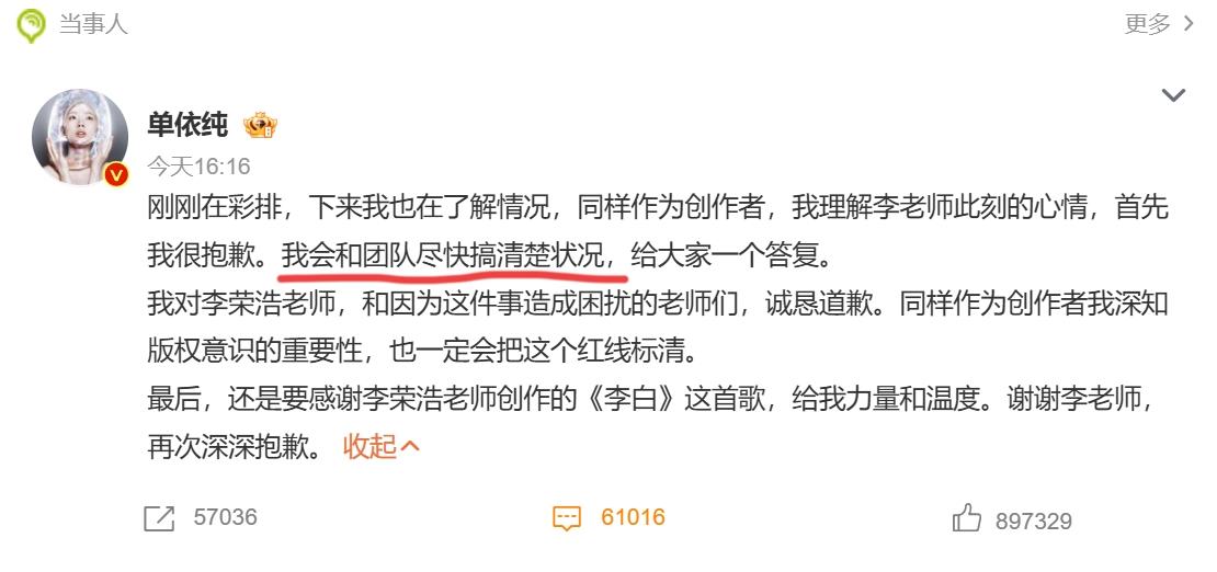 单依纯甩锅团队, 李荣浩早把后路堵完 这样的道歉人家不买账 单依纯说的这些,纯属搬起石头砸自己的脚,李荣浩那是早早就把后路给她堵完了,半点情面都没留,说句实在的真不冤 我个人觉得李荣浩这次是真的被惹急了,不然也不会把话说得那么绝,他提前就放话不让单依纯甩锅团队,说这不符合你,这话看着是提醒,实则就是不给她任何推诿的余地,明摆着就是告诉她这事你逃不掉,别想拿团队当挡箭牌 最关键的一点,这场演唱会的总监制是单依纯自己,咱就唠句实在的,总监制那就是整场演出的大管家,从曲目选择到流程合规,没有一样能逃过她的眼睛 翻唱别人的歌要授权这是乐坛最基本的规矩,她作为总监制,不可能不知道,这不是自欺欺人,是把大家当傻子,更是打自己的脸 而且她这波道歉太没诚意,也太不明智了,李荣浩都把话说到那份上了,她还非要硬着头皮甩锅团队,说要和团队核实情况,潜台词就是自己没责任,全是团队的错,也难怪李荣浩不买账,换谁被人这么敷衍,都得生气 出了问题第一反应不是认错,而是甩锅,真的是寒了前辈的心,人家这次之所以不给她后路,说白了就是看不惯这种不负责任敷衍了事的态度 原创音乐人最看重的就是版权,你不尊重人家的劳动成果,还想靠甩锅蒙混过关,换谁都得较真,单依纯明明是有天赋的歌手,却偏偏在担当上掉了链子,放着真诚道歉的路不走,非要选最败好感的甩锅方式 你们说她这波操作,除了耗光自己的口碑还能给自己留什么?
